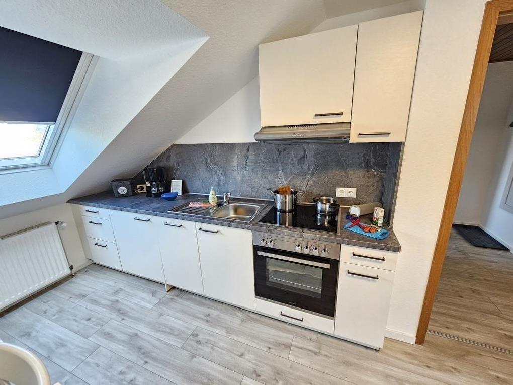 Ferienwohnung im 1 OG, 1 Schlafraum mit einem Doppelbett, 1 Wohnschlafraum mit Schlafsofa und Küchenzeile, TV und Radio, DU/WC, WLAN kostenlos, Nichtraucher