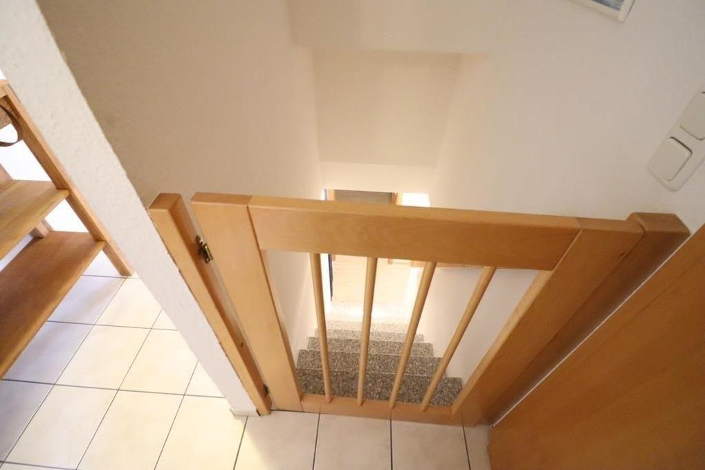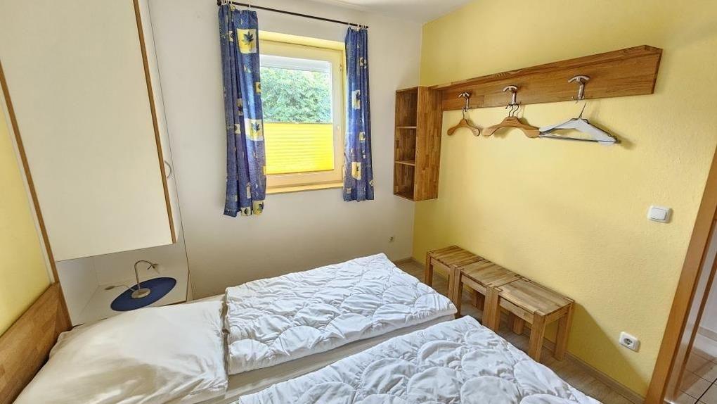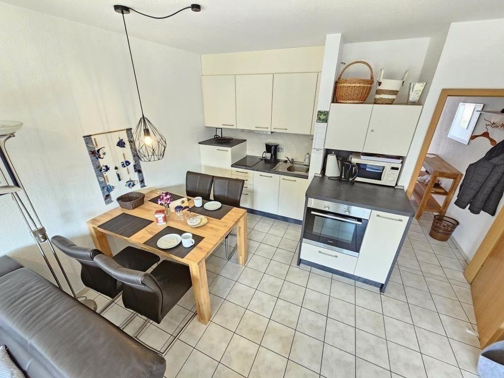 Gemütliche Ferienwohnung für bis zu 4 Personen mit schöner Westterrasse und Garten, 1 Schlafraum mit Doppelbett im Erdgeschoss, 1 Schlafraum mit Doppelbett im Souterrain, Treppengitter ist vorhanden, 1 Wohnraum mit integrierter Küchenzeile, Backofen und Mikrowelle, Dusche / WC