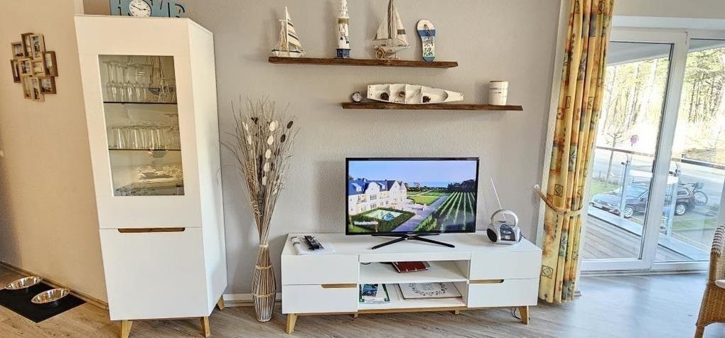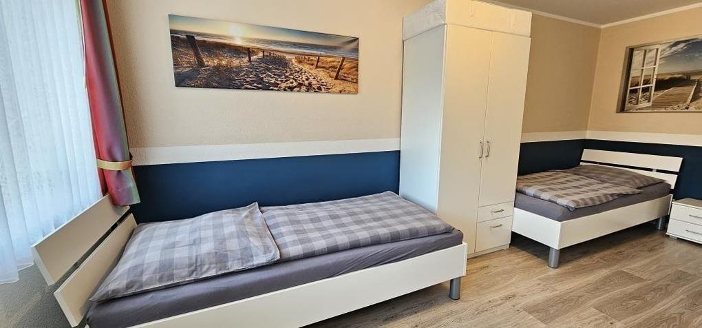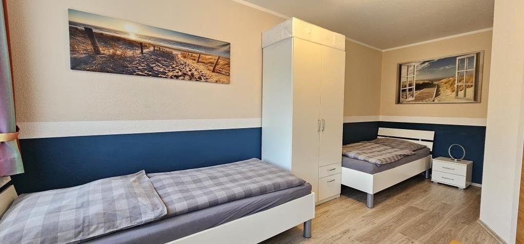 Gemütliche Ferienwohnung mit einem Schlafraum mit einem Doppelbett, einem Schlafraum mit zwei Einzelbetten, ein Wohnraum, Küchenzeile mit Geschirrspüler, Backofen und Kühlschrank, Dusche / WC, 2 x TV