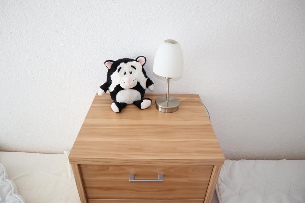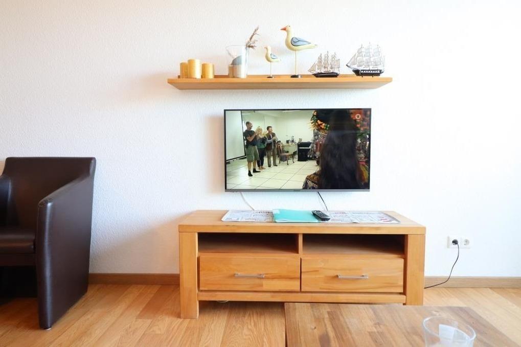 Gemütliche Ferienwohnung im Haus Nordseebrandung mit einem Schlafraum mit einem Doppelbett, einem Schlafraum mit zwei Einzelbetten, ein Wohnraum, separate Küche mit Mikrowelle, Backofen, Geschirrspüler und Kühlschrank, Abstellraum, Dusche / WC, Föhn, Radio-CD, TV