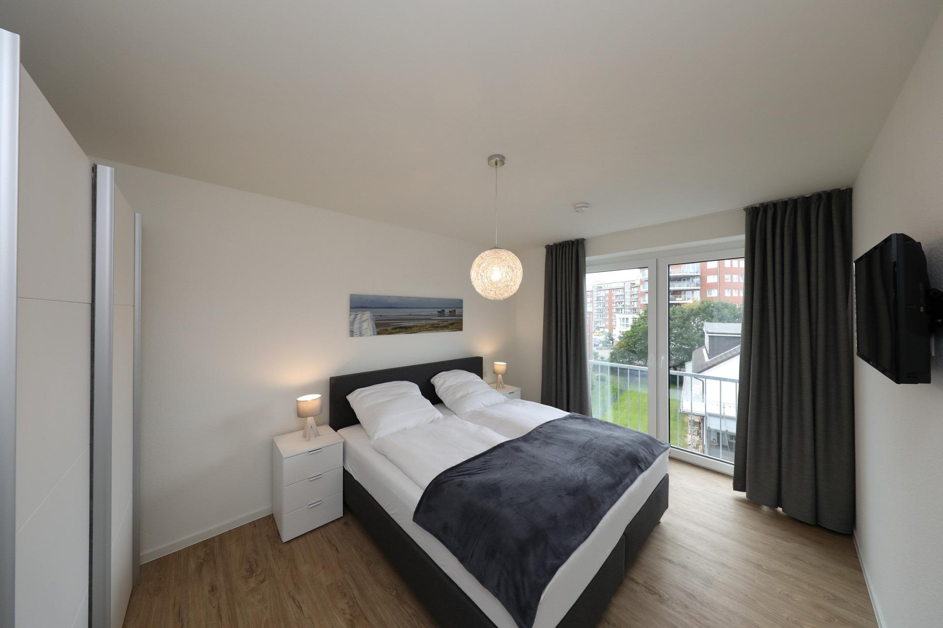 Das Schlafzimmer punktet mit einem gemütlichen Boxspringbett (180 x 200 cm) und Verdunklungsgardinen. Zwei weitere Gäste können bequem auf der hochwertigen Schlafcouch im Wohnzimmer (160 x 200 cm) übernachten. Auch hier sind Verdunklungsgardinen vorhanden.
