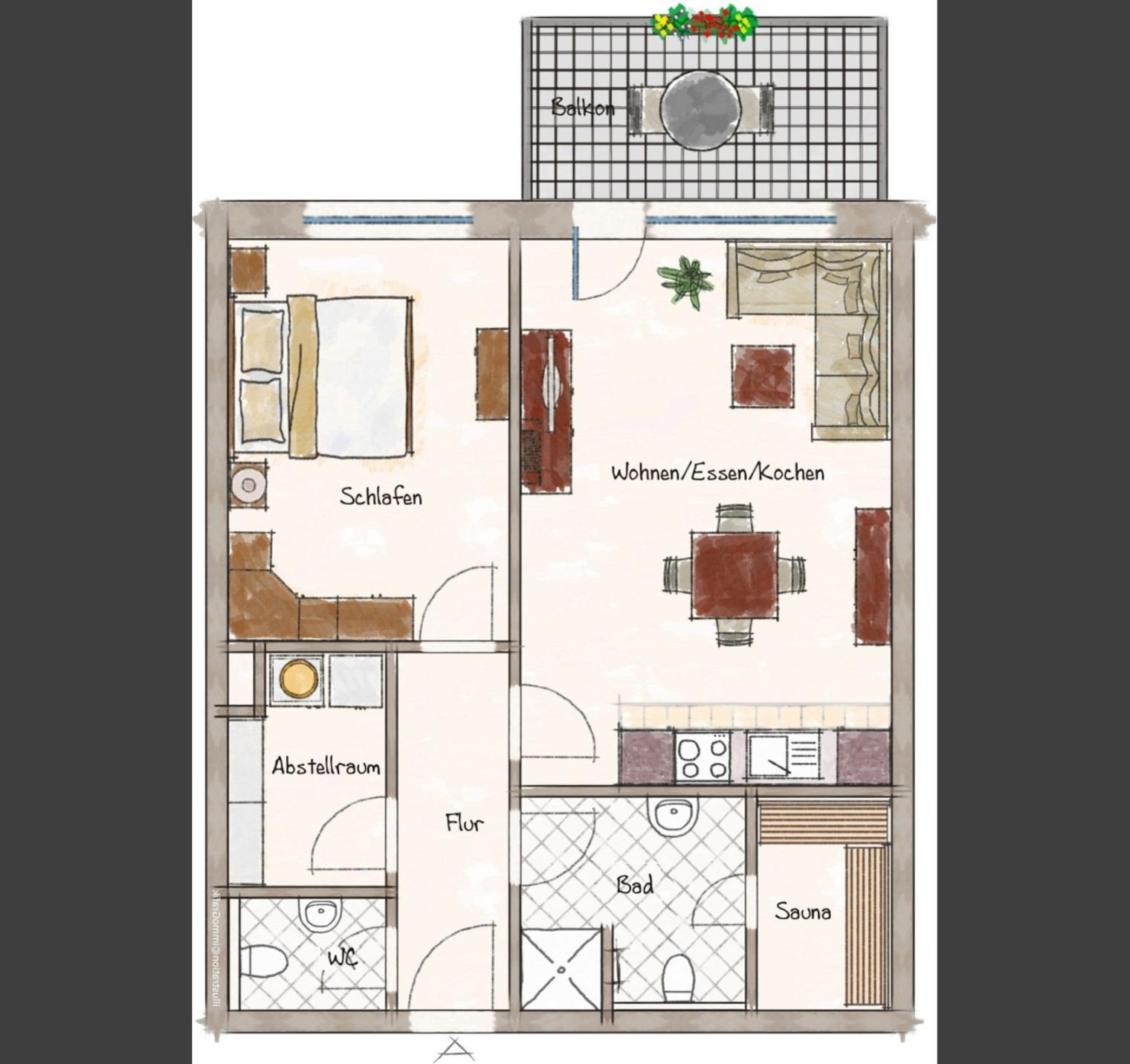 Genießen Sie ab dem Nachmittag die Sonne und den seitlichen Meerblick auf unserem Balkon mit Markise. Im offenen Essbereich lassen sich gemütliche Abende bei Gesellschaftsspielen oder einem Glas Wein verbringen. Gönnen Sie sich nach einem abwechslungsreichen Tag eine entspannte Auszeit in der wohnungseigenen Sauna.