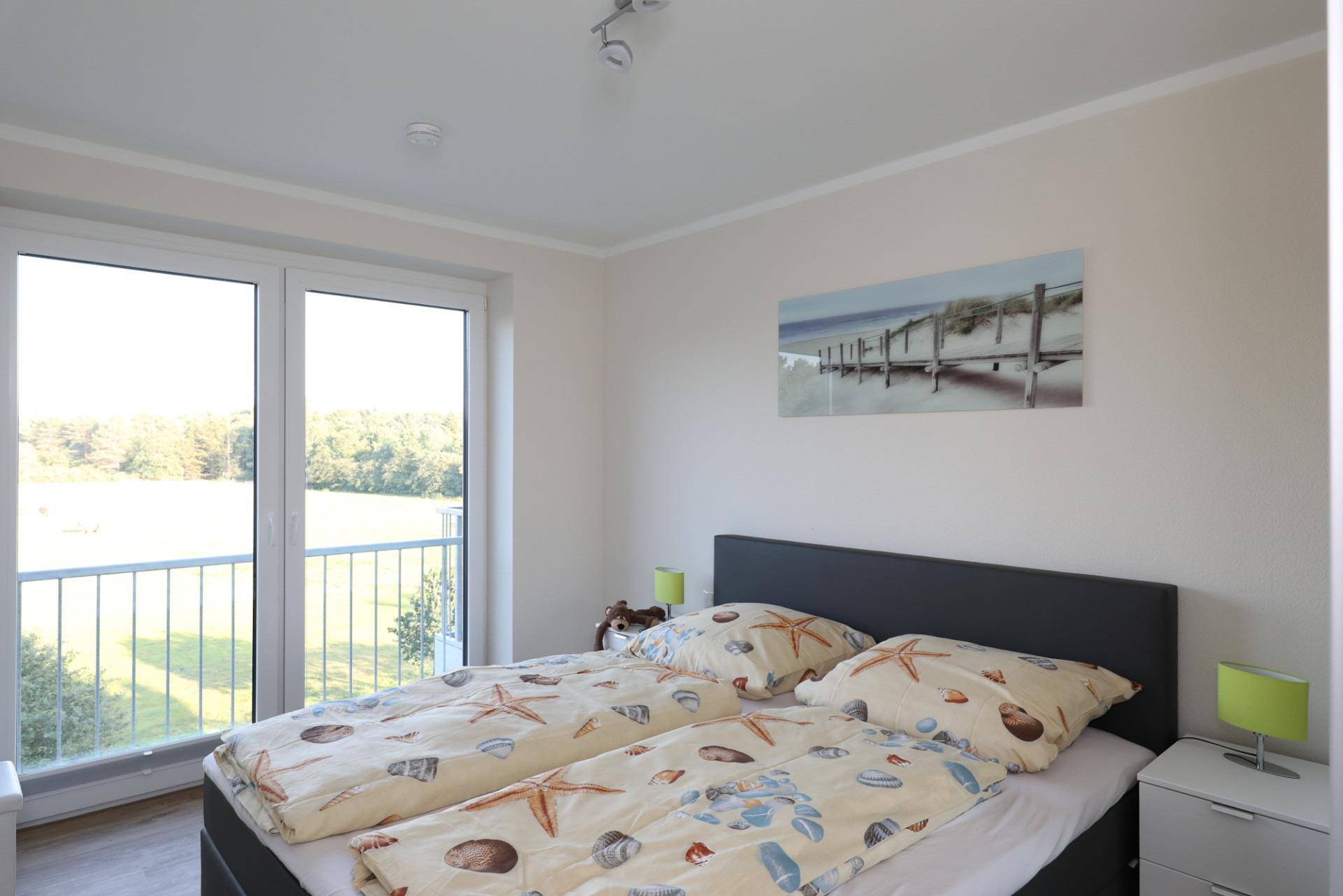 Das Schlafzimmer ist mit einem Boxspringbett, Plissees am bodentiefen