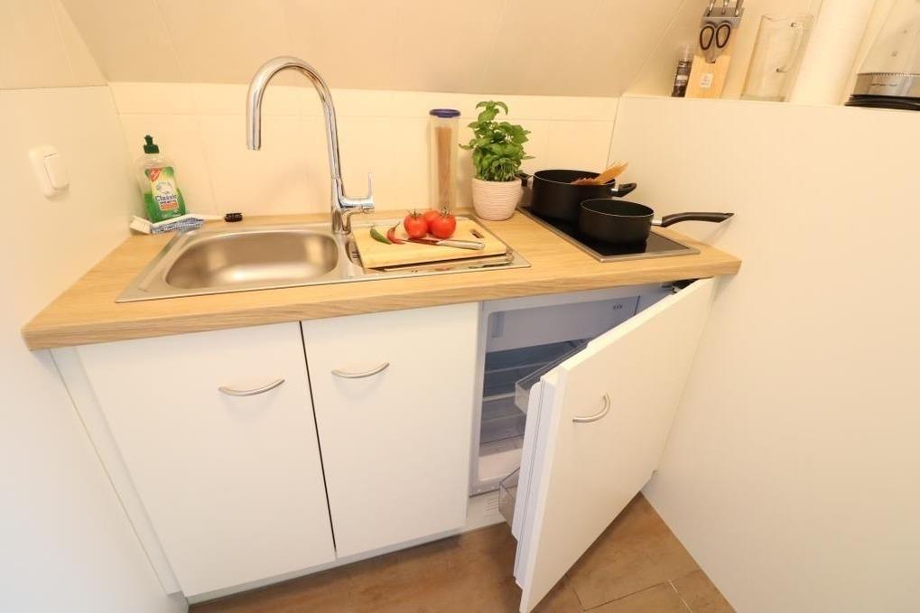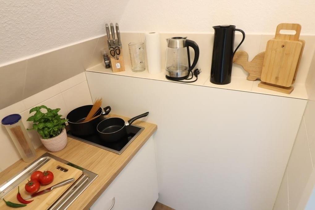 Es steht Ihnen ein Schlafraum mit einem Doppelbett 1,80m x 2m für einen ruhigen Schlaf zur Verfügung. Genießen Sie einen ruhigen TV-Abend oder entspannte Stunden mit einem Buch im gemütlichen Wohnraum. In der Wohnküche ein schönes Essen genießen oder einen Spieleabend veranstalten. Dafür steht Ihnen ein großer Essplatz zur Verfügung. Die kleine Küchenzeile ist mit einem 2-Platten-Ceranfeld, einer Mikrowelle mit Ofenfunktion und einem Kühlschrank mit Gefrierfach ausgestattet.