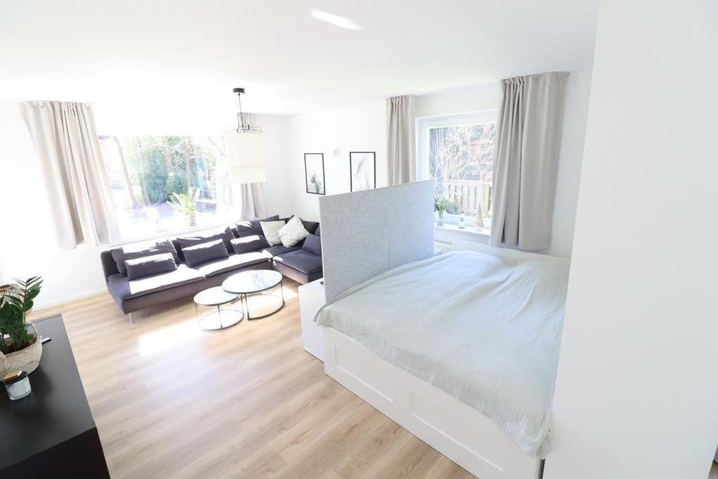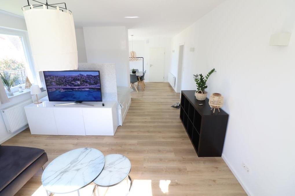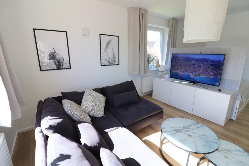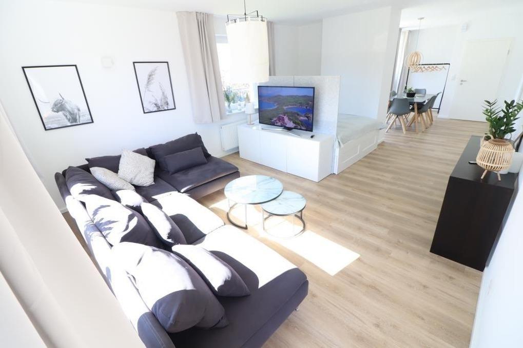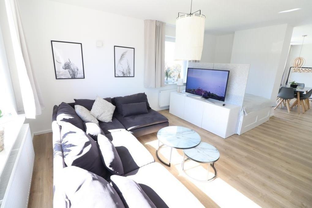 Es stehen Ihnen 1 Schlafraum mit einem Doppelbett und ein Wohnschlafraum mit einem Doppelbett zur Verfügung. Genießen Sie Ihren Aufenthalt machen Sie es sich in dem hellen, freundlichen Wohnraum mit Sofa gemütlich. Entweder bei einem spannenden TV-Abend oder am vielleicht ein Spieleabend am großen Esstisch. Die Küche ist ausgestattet mit einer modernen Küchenzeile mit einem Kühlschrank, einem Backofen, einem Ceranfeld und einem Geschirrspüler.