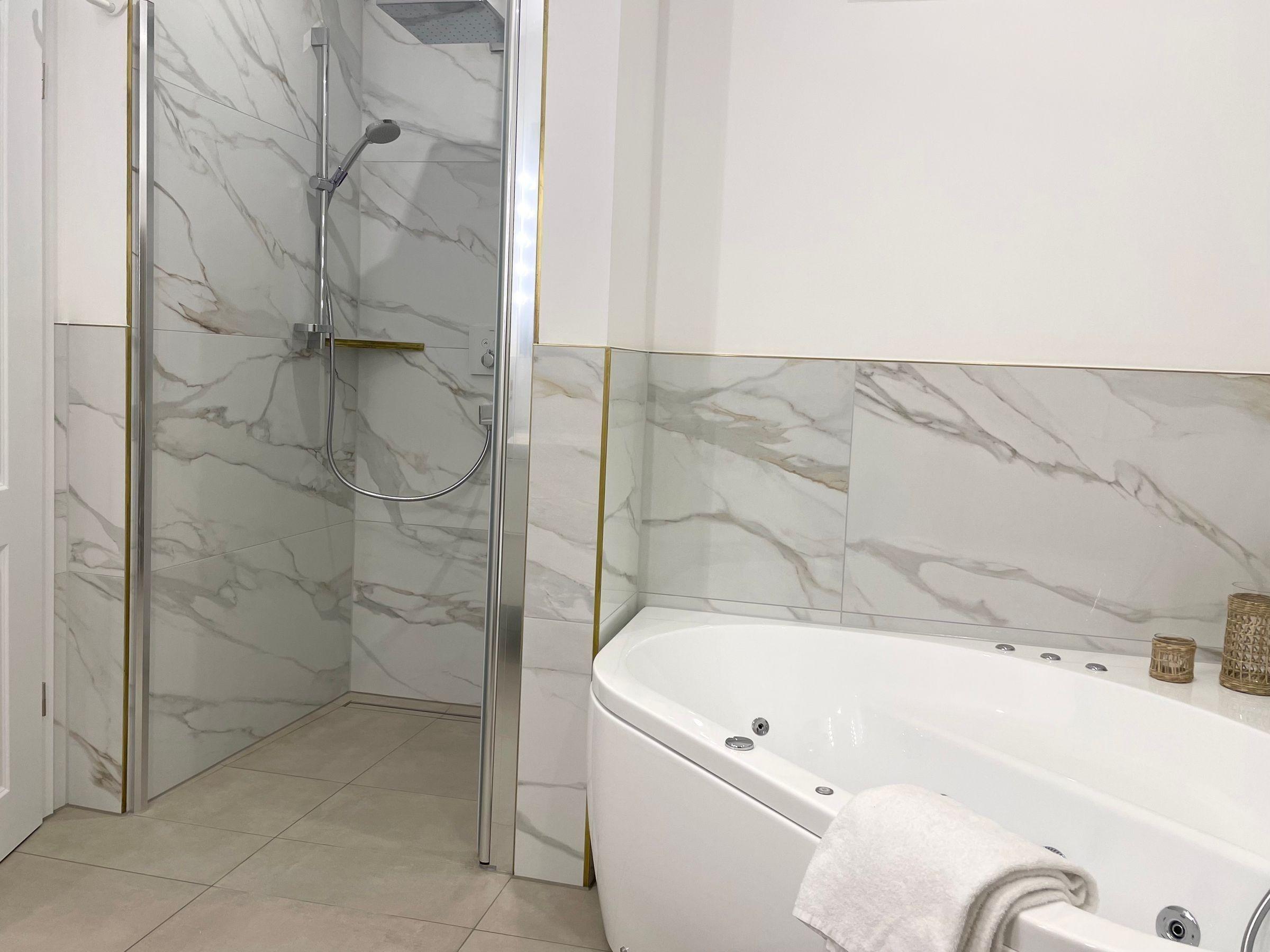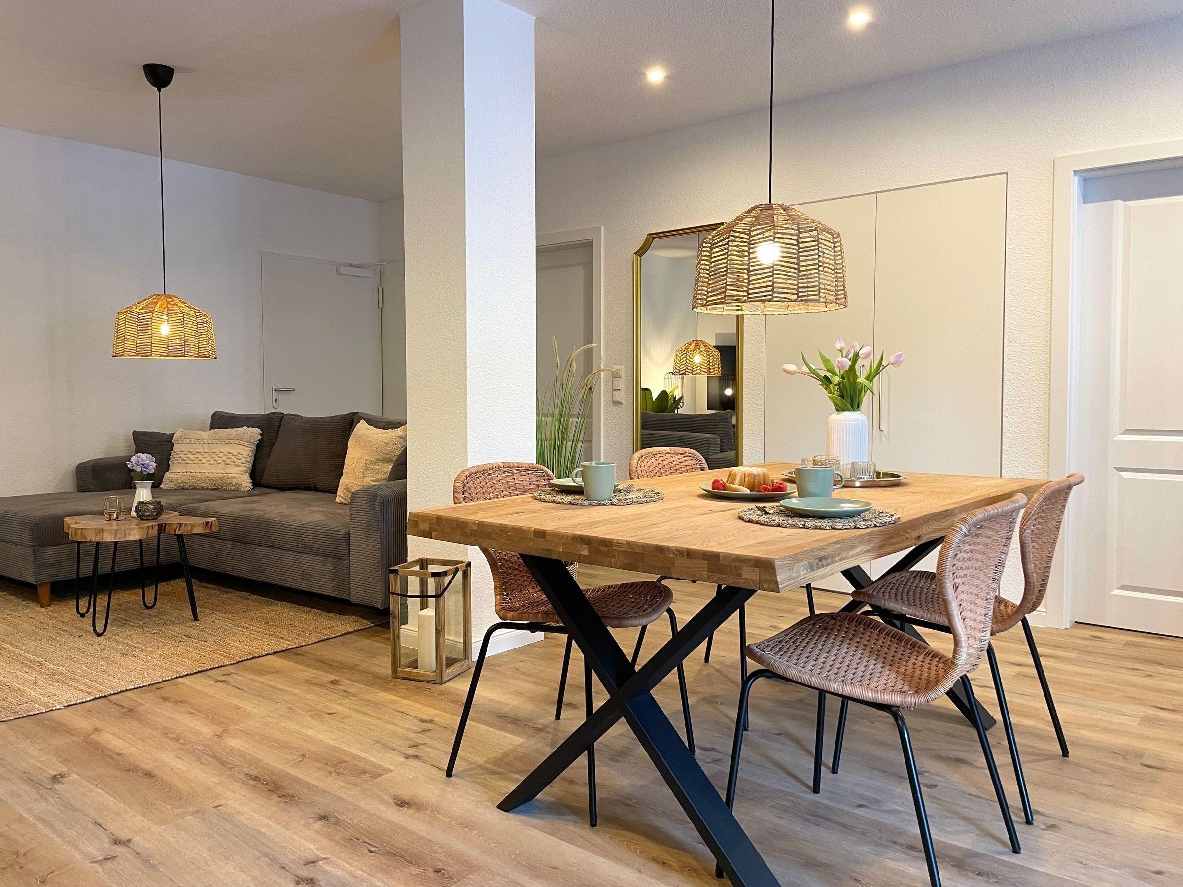 Im „Haus Nordseebrandung FeWo 4“ erwartet die Gäste eine stilvoll eingerichtete Ferienwohnung auf 90 m², die bis zu 6 Personen Platz bietet. Zwei gemütliche Schlafzimmer sind mit hochwertigen Betten ausgestattet und garantieren erholsame Nächte. Das Wohnzimmer mit einem komfortablen Schlafsofa lädt zum Entspannen ein, unterstützt durch drei Fernseher und WLAN. Die offene, voll ausgestattete Küche ermöglicht die Zubereitung von Lieblingsgerichten und bietet einen Essbereich für gesellige Abende. Die Wellness-Ausstattung umfasst eine private Sauna und eine Whirlpool-Badewanne, während zwei moderne Badezimmer mit bodengleicher Dusche und Badewanne zusätzlichen Komfort bieten. Die Wohnung ist ideal für einen entspannenden Urlaub an der Nordsee und verbindet Komfort mit einer einladenden Atmosphäre.