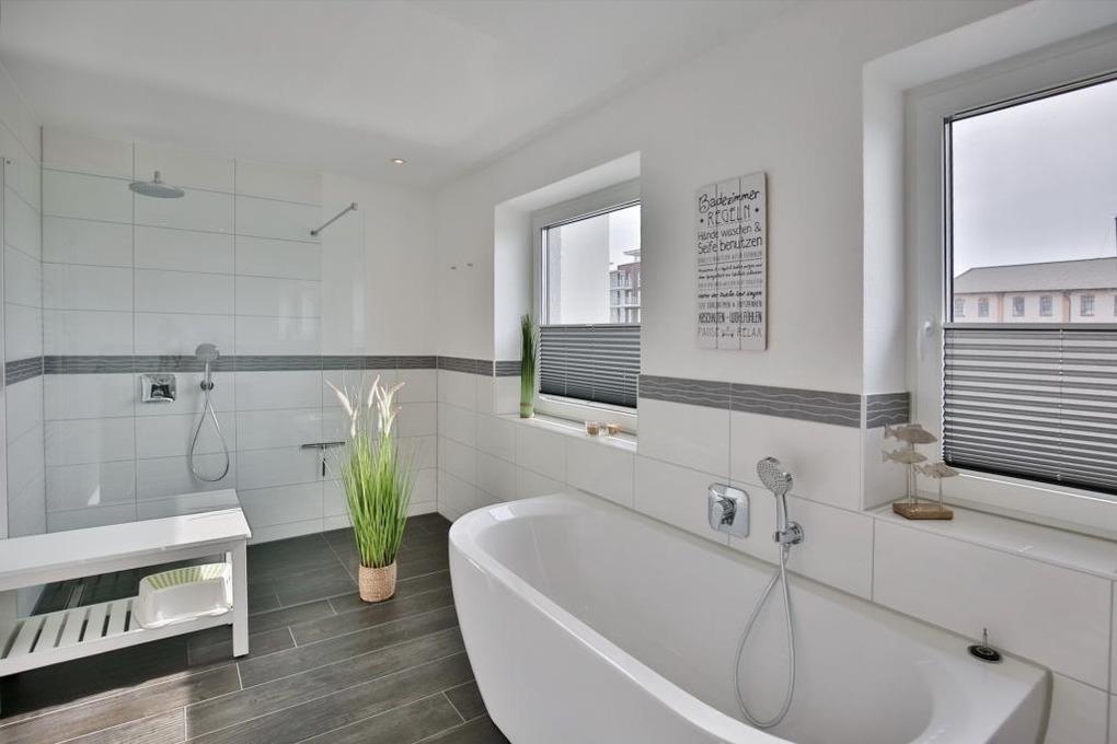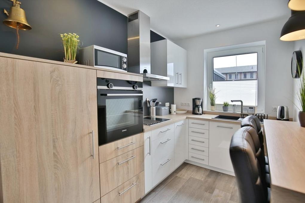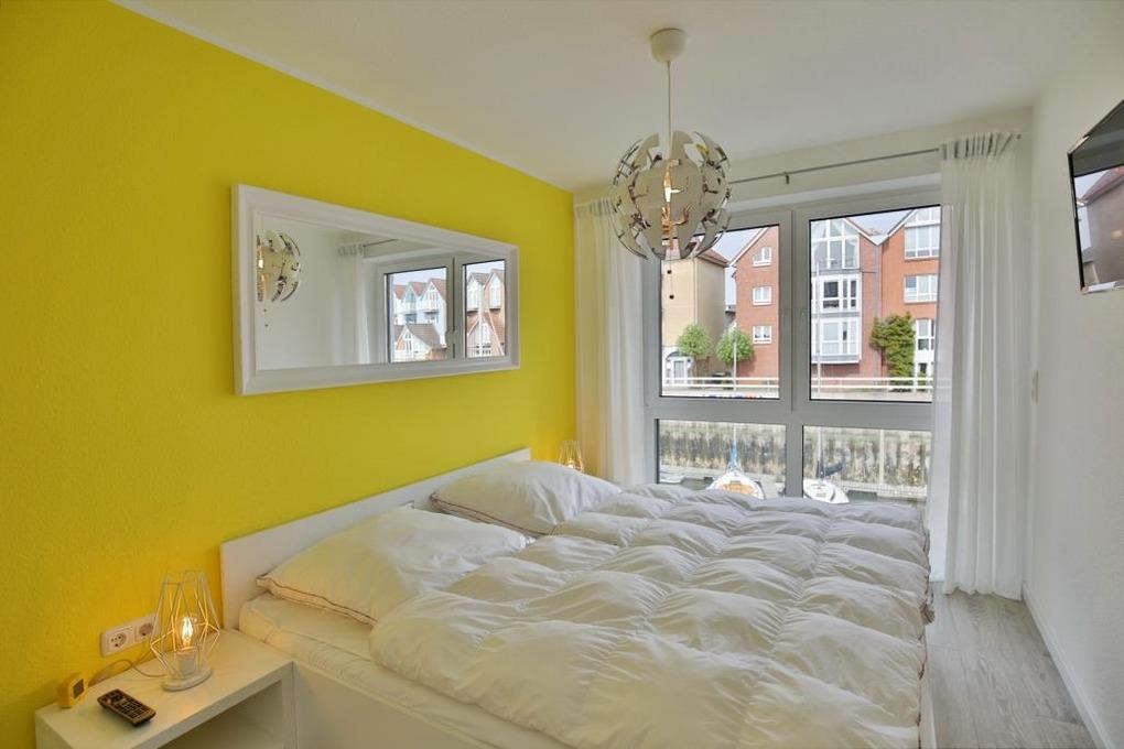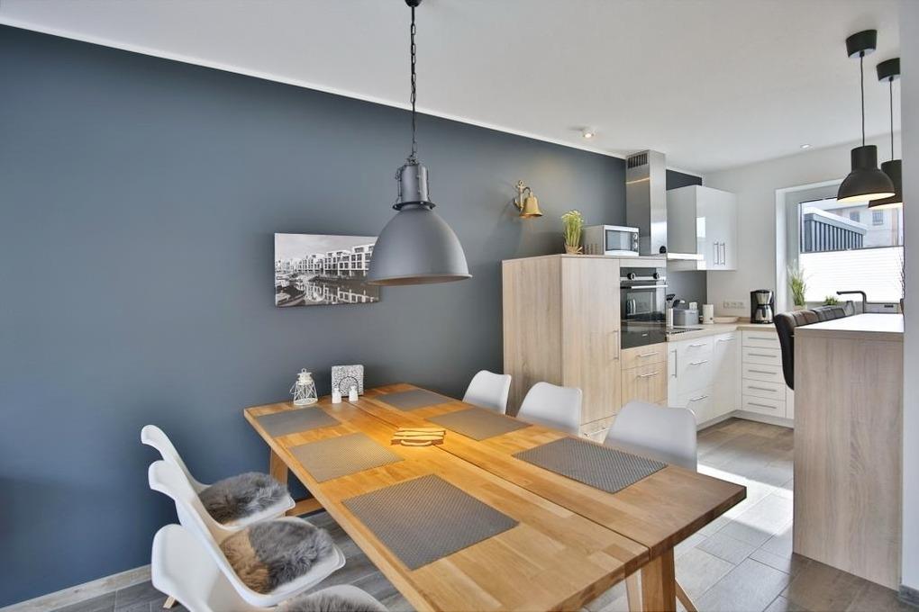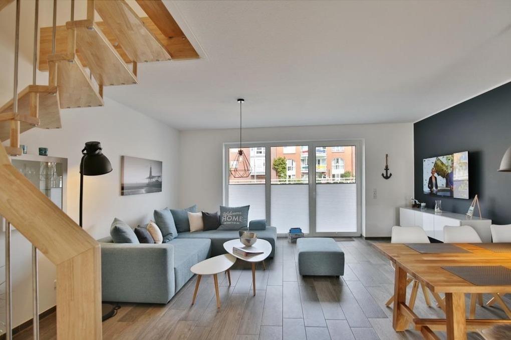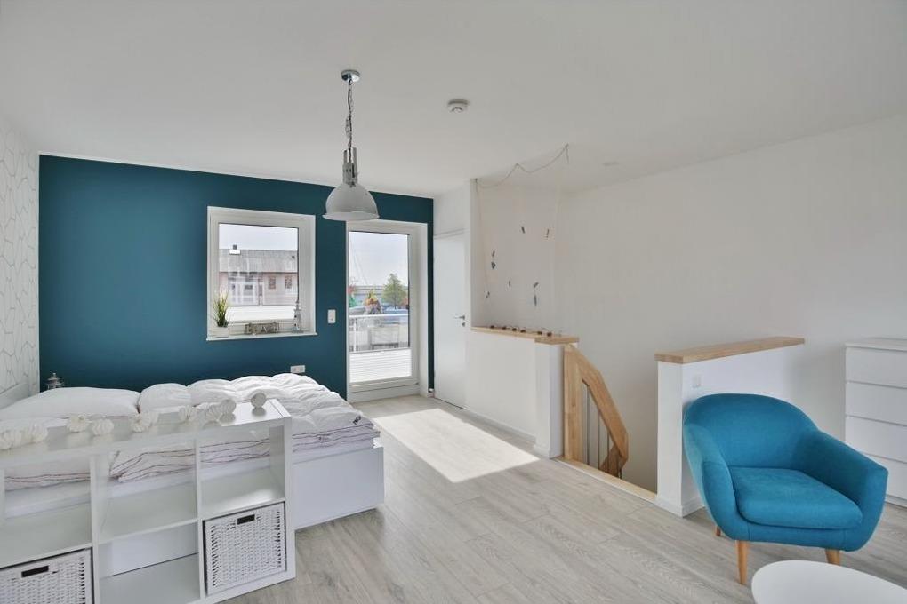 Geschmackvolles, modernes Stadthaus im Yachthafen für bis zu 6 Pers. auf 3 Etagen mit absoluter Vollausstattung. Großzügiges Wohnzimmer mit offener Küchenzeile (Backofen, Geschirrspüler, Waschmaschine, Nespresso Kaffeemaschine etc.) mit Tresen, große Terrasse (west) mit Blick in die City Marina, Kabel-TV, Gäste/WC. 1.OG: 2 komfortable Schlafzimmer mit Doppelbetten und jeweils mit TV, großes Bad/Du/WC, Föhn, 2.OG: Großzügige Lounge mit Doppelbett, TV, große Dachterrasse (west) [&] Balkon (ost), Abstellraum mit Waschmaschine [&] Trockner. Kostenfreies W-Lan im ganzen Haus. Privater Fahrradschuppen, 1 PKW-Stellplatz am Haus.