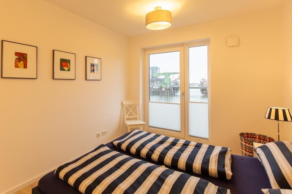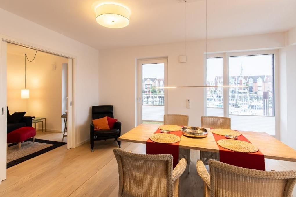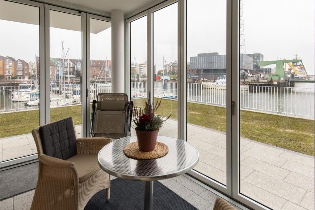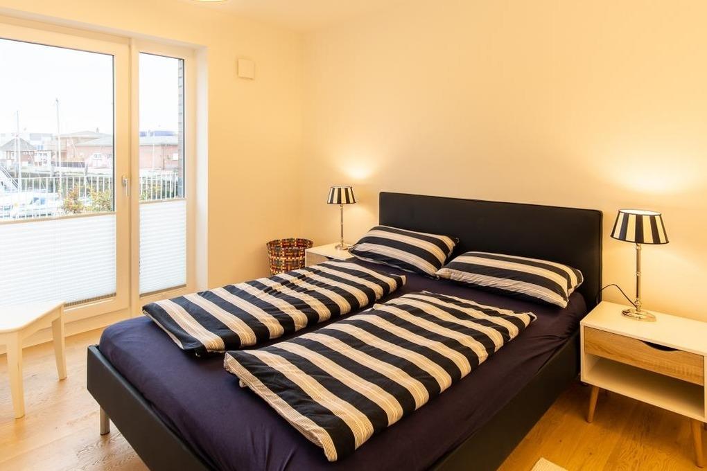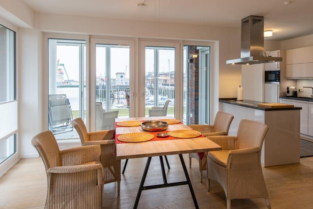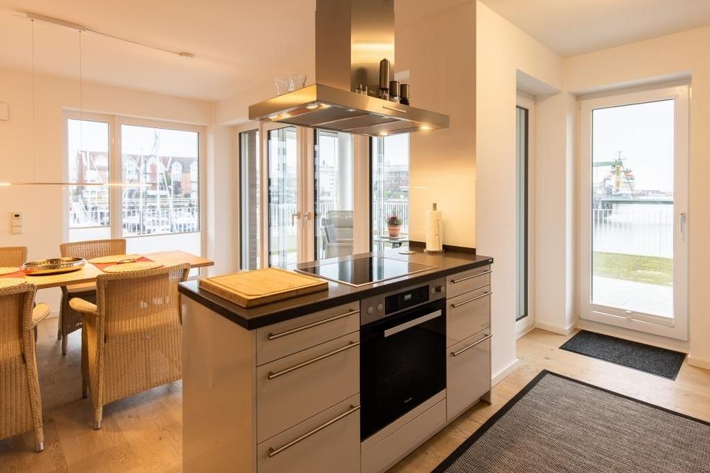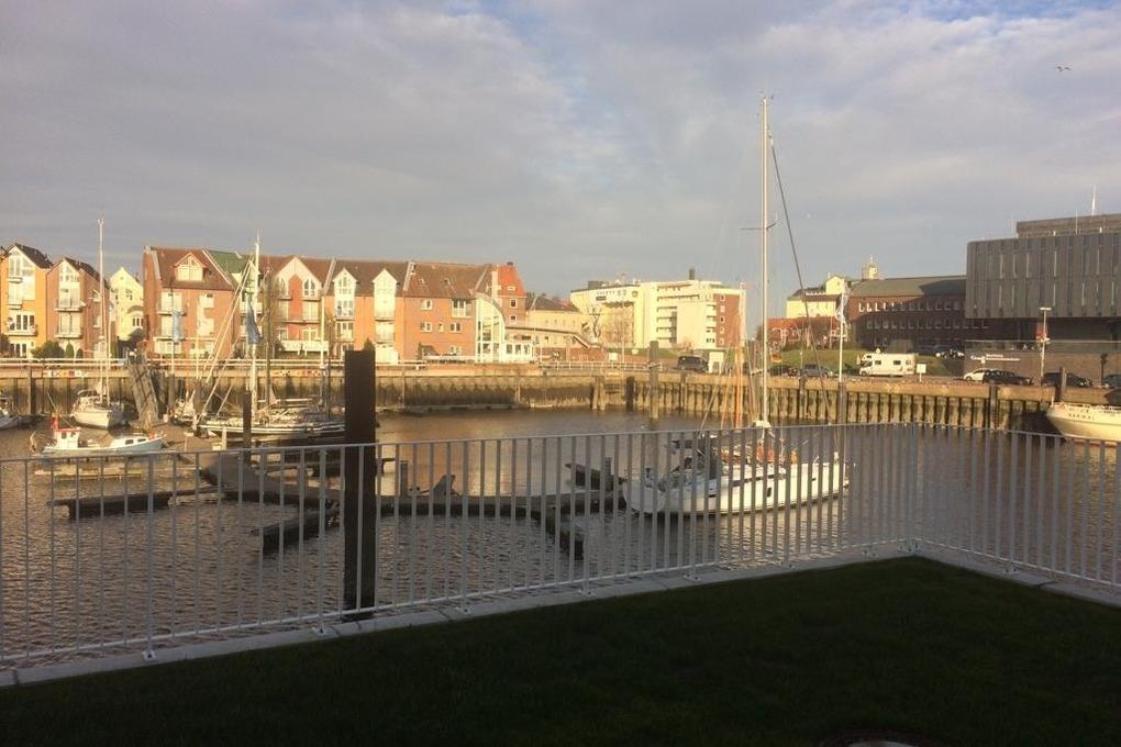 Neubau. 3 -Zimmer-Ferienwohnung mit Loggia, Terrasse und Garten in einmaliger Lage am Kai der City Marina. Es erwartet Sie viel Platz zum entspannen und genießen. Großzügiges Ess-/ Wohnzimmer mit angrenzender Loggia, großes Schlafzimmer mit Doppelbett (1,60m breit), weiteres Wohnzimmer mit Schlafsofa und TV, hochwertige Küche mit Kochinsel, Nespresso-Kaffeemaschine, Bad mit großer, bodengleicher Dusche, Waschmaschine und Trockner. Barrierefreie Erdgeschosslage, TG-Stellplatz # 48. Natürlich Nichtraucher und keine Haustiere.