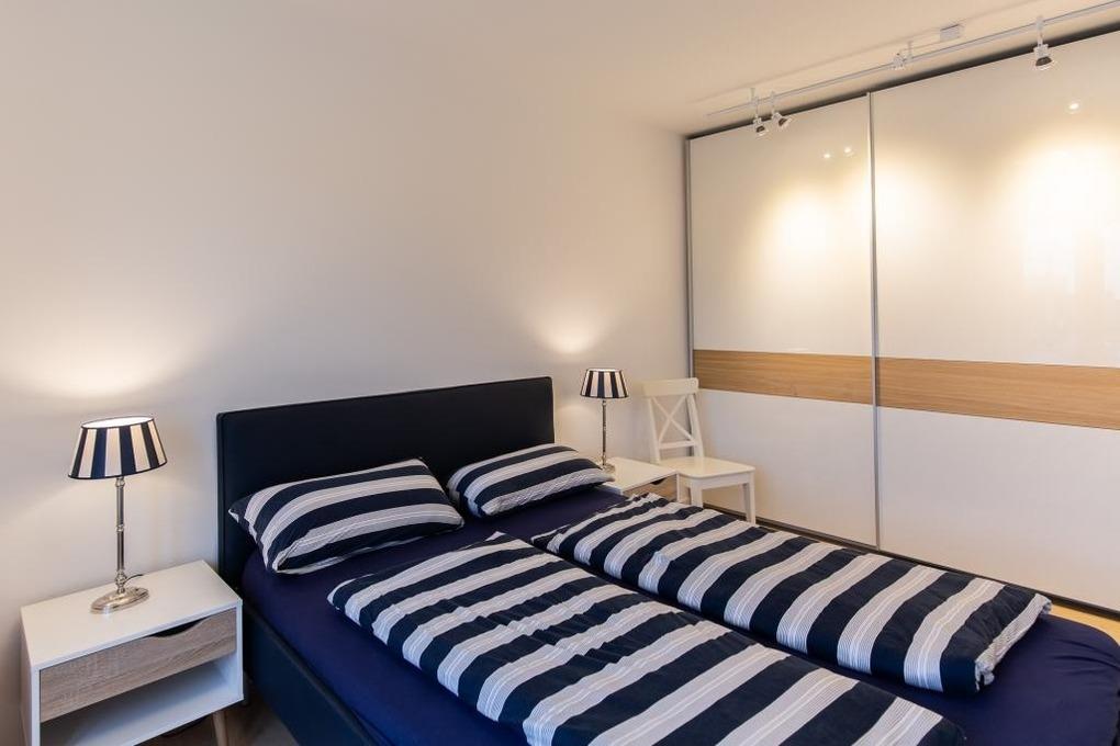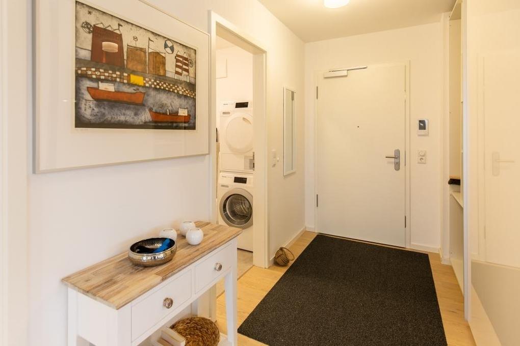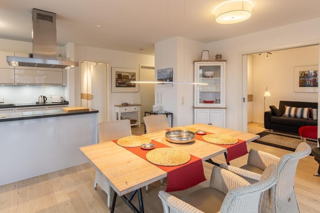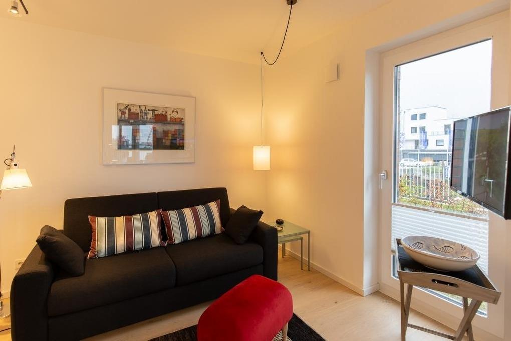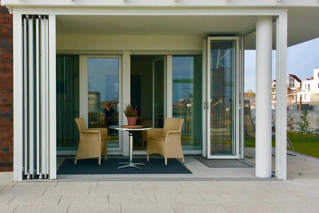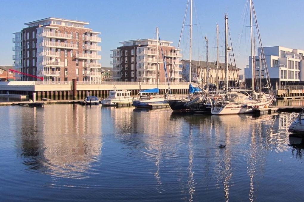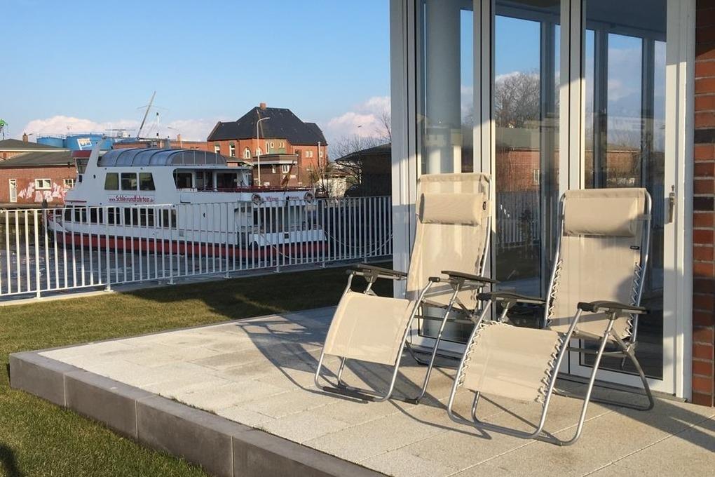 Neubau. 3 -Zimmer-Ferienwohnung mit Loggia, Terrasse und Garten in einmaliger Lage am Kai der City Marina. Es erwartet Sie viel Platz zum entspannen und genießen. Großzügiges Ess-/ Wohnzimmer mit angrenzender Loggia, großes Schlafzimmer mit Doppelbett (1,60m breit), weiteres Wohnzimmer mit Schlafsofa und TV, hochwertige Küche mit Kochinsel, Nespresso-Kaffeemaschine, Bad mit großer, bodengleicher Dusche, Waschmaschine und Trockner. Barrierefreie Erdgeschosslage, TG-Stellplatz # 48. Natürlich Nichtraucher und keine Haustiere.