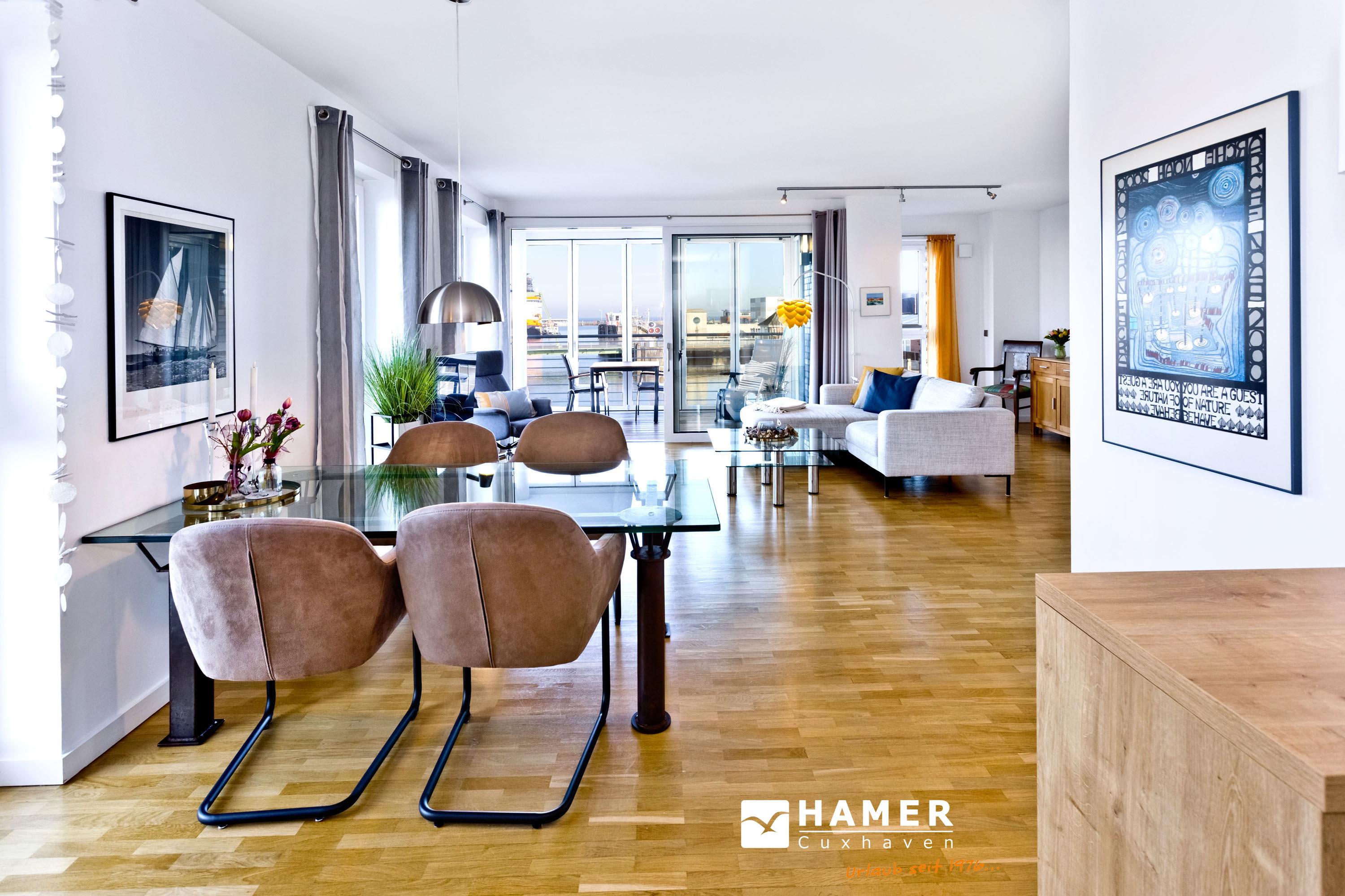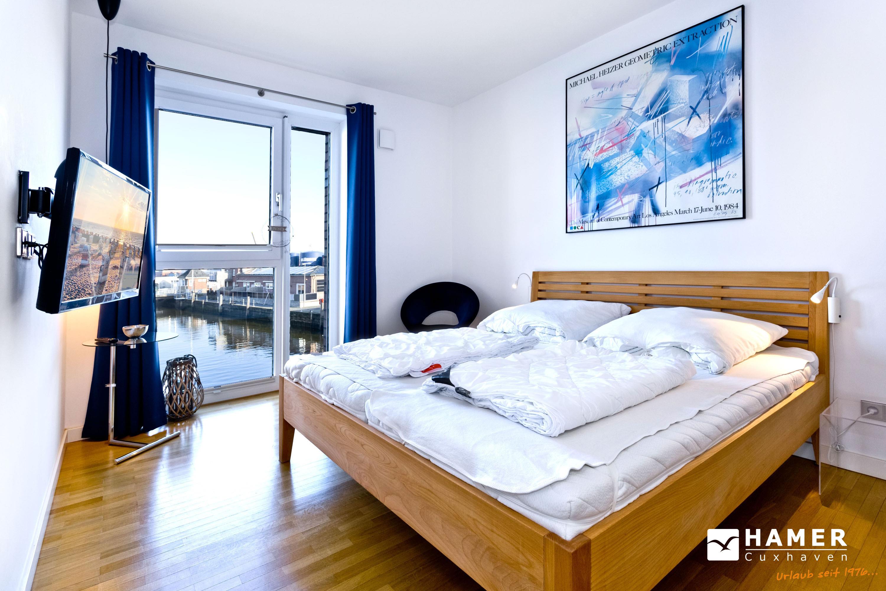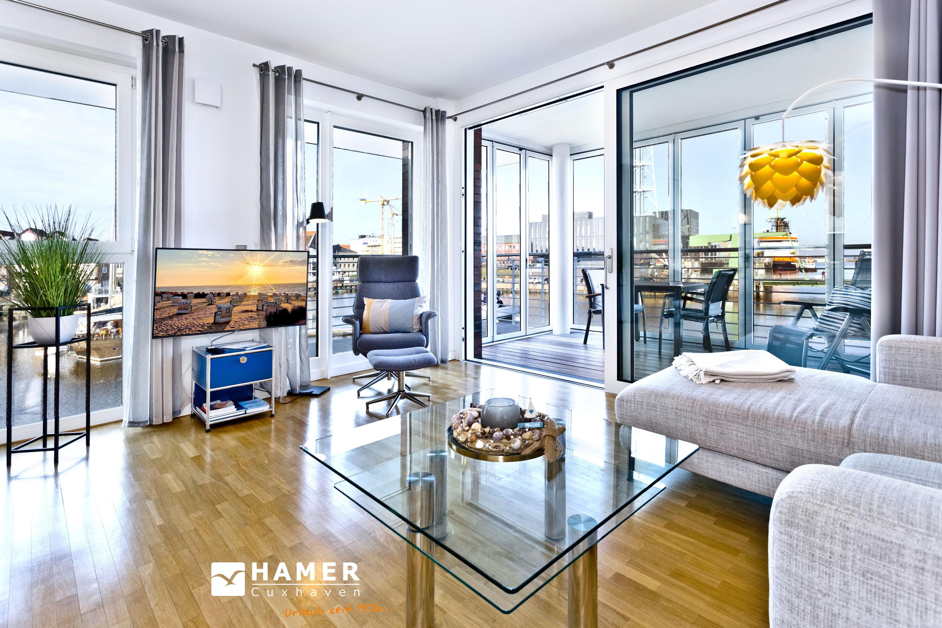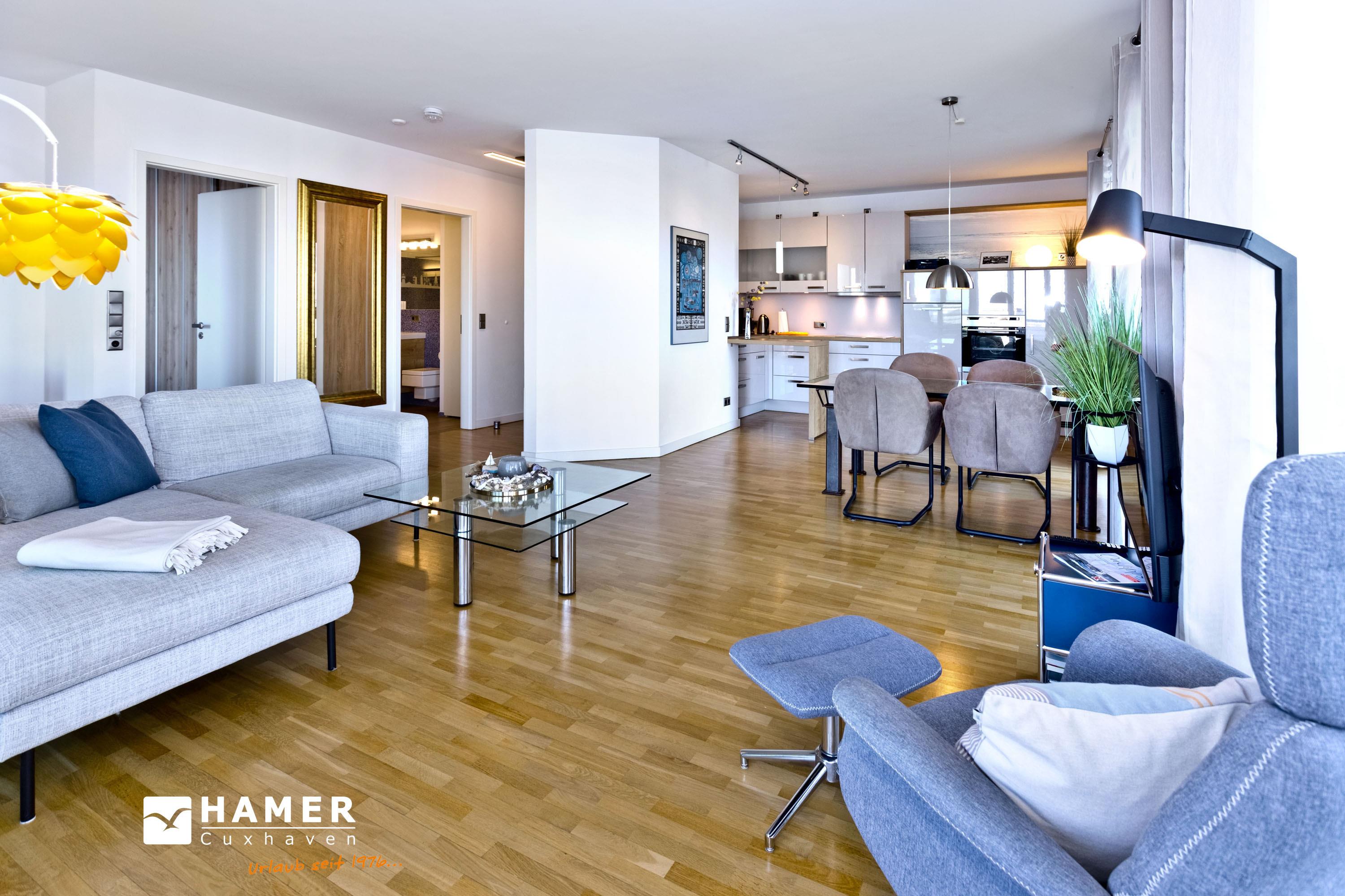 Direkt an der Marina Cuxhaven gelegene Neubauwohnung über ca. 80m². Tolle 2 Zi. Luxus-Wohnung in der 1. Etage mit Seesicht für max. 2Pers. ausgestattet, großzügiges Wohnzimmer mit großem Balkon (nord/west). Dieser Balkon wird in den Wintermonaten teilweise zur Loggia umgebaut. Vollständig ausgestattete Küchenzeile, 1 Schlafzimmer mit Doppelbetten, alle Räume sind über elektr. Außenjalousien zu verdunkeln (Wohnraum teilweise), 2xTV, Radio/CD, kostenloses W-Lan-Internet, ebenerdige Dusche/WC, reservierter Pkw-Stellplatz in der Tiefgarage #49, Nichtraucher und es sind keine Haustiere gestattet.