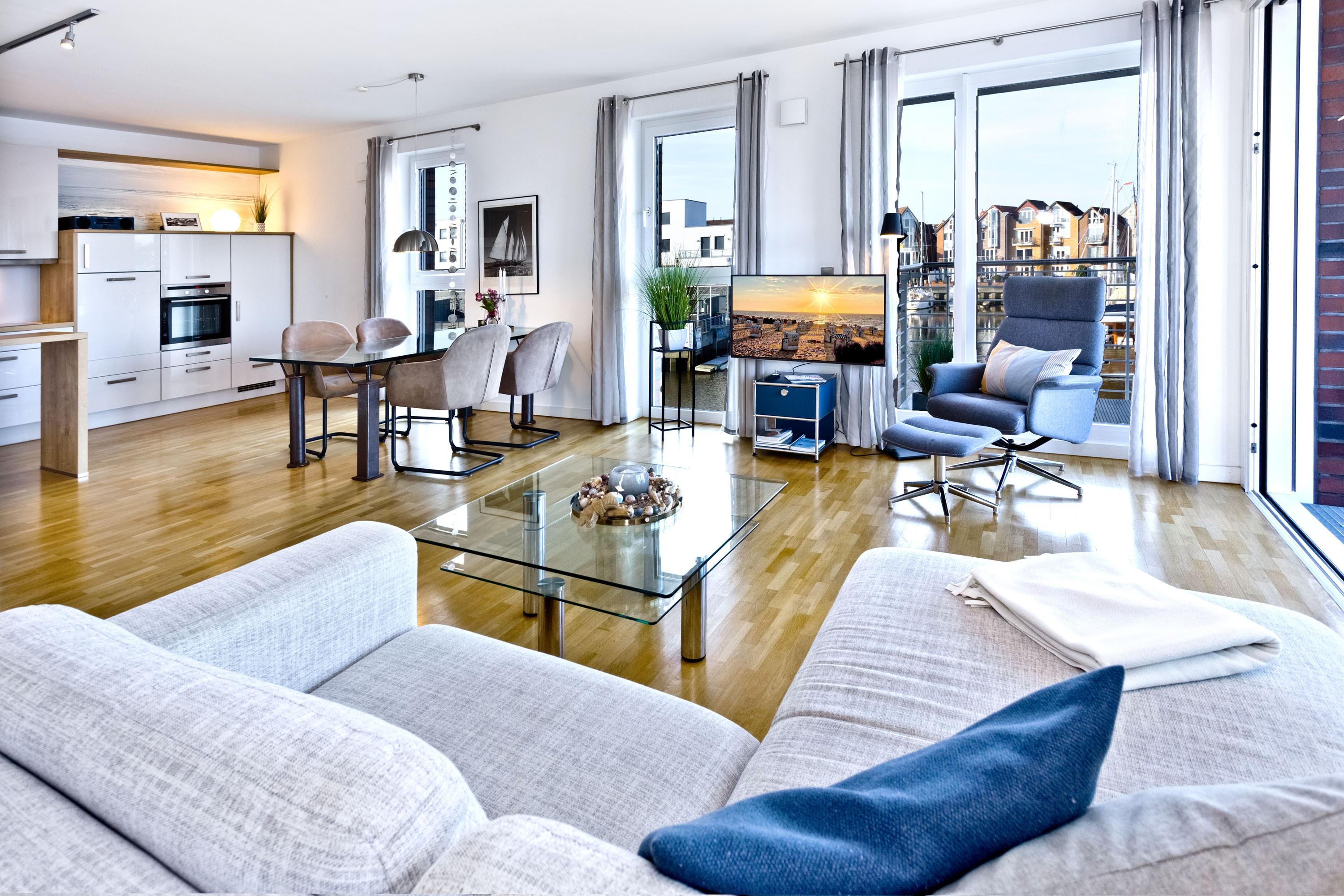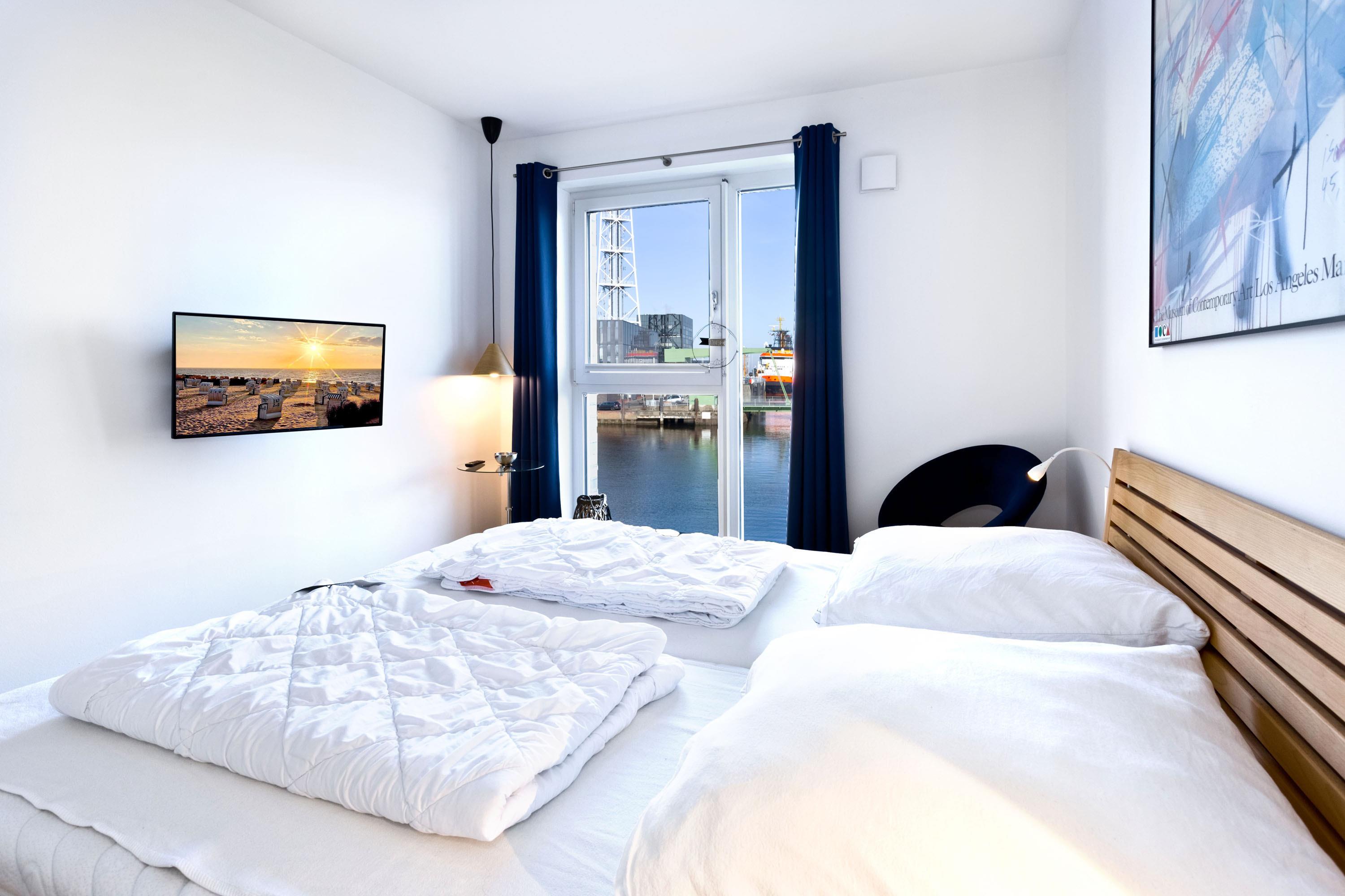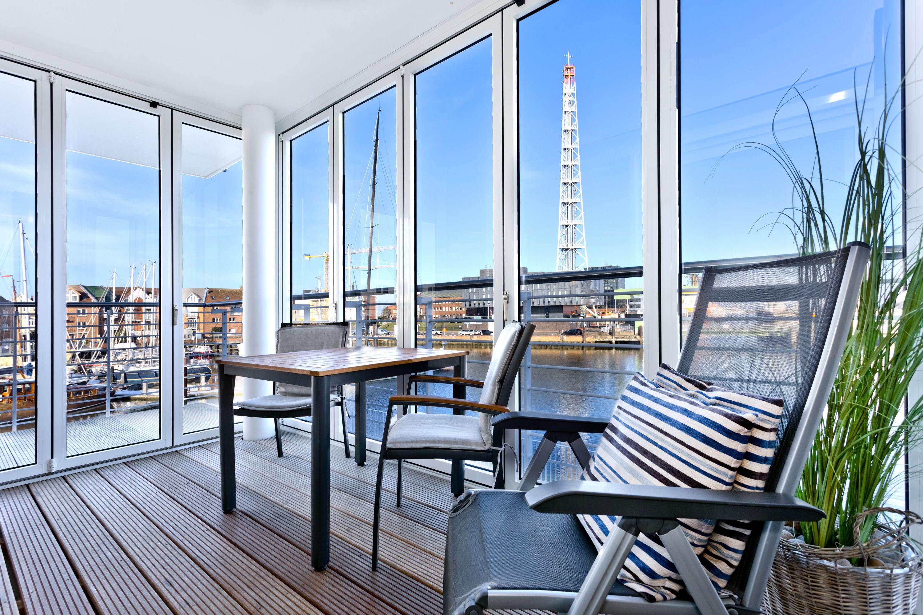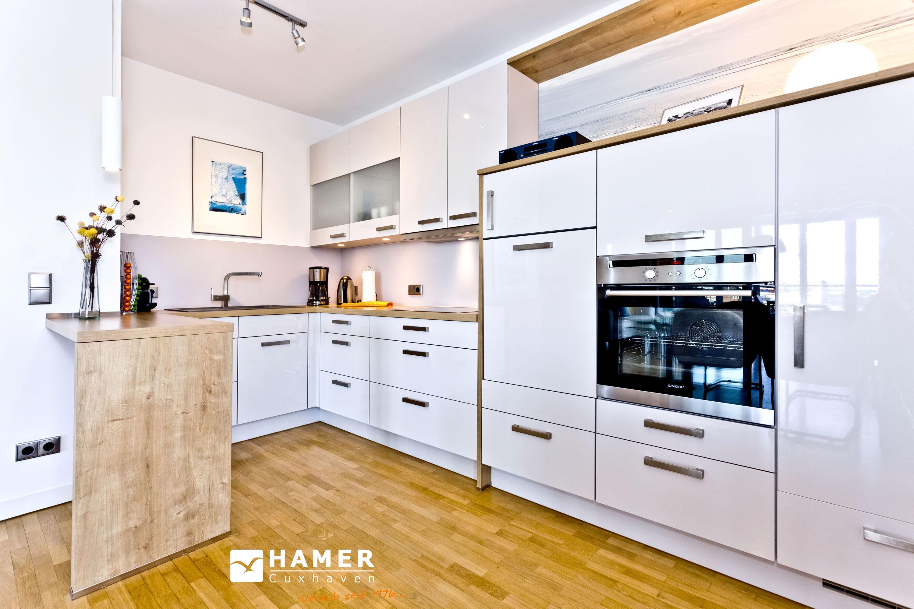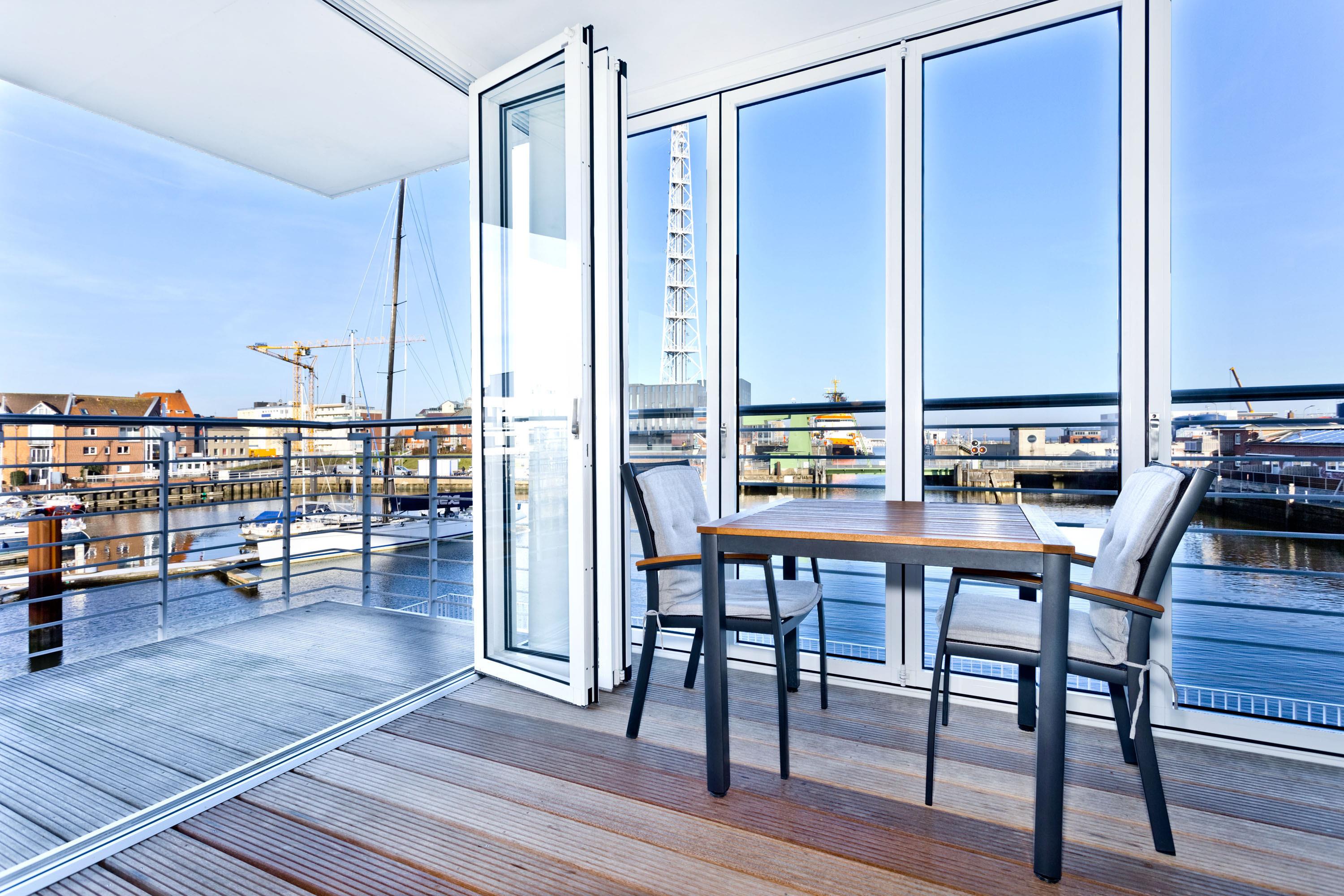 Direkt an der Marina Cuxhaven gelegene Neubauwohnung über ca. 80m². Tolle 2 Zi. Luxus-Wohnung in der 1. Etage mit Seesicht für max. 2Pers. ausgestattet, großzügiges Wohnzimmer mit großem Balkon (nord/west). Dieser Balkon wird in den Wintermonaten teilweise zur Loggia umgebaut. Vollständig ausgestattete Küchenzeile, 1 Schlafzimmer mit Doppelbetten, alle Räume sind über elektr. Außenjalousien zu verdunkeln (Wohnraum teilweise), 2xTV, Radio/CD, kostenloses W-Lan-Internet, ebenerdige Dusche/WC, reservierter Pkw-Stellplatz in der Tiefgarage #49, Nichtraucher und es sind keine Haustiere gestattet.