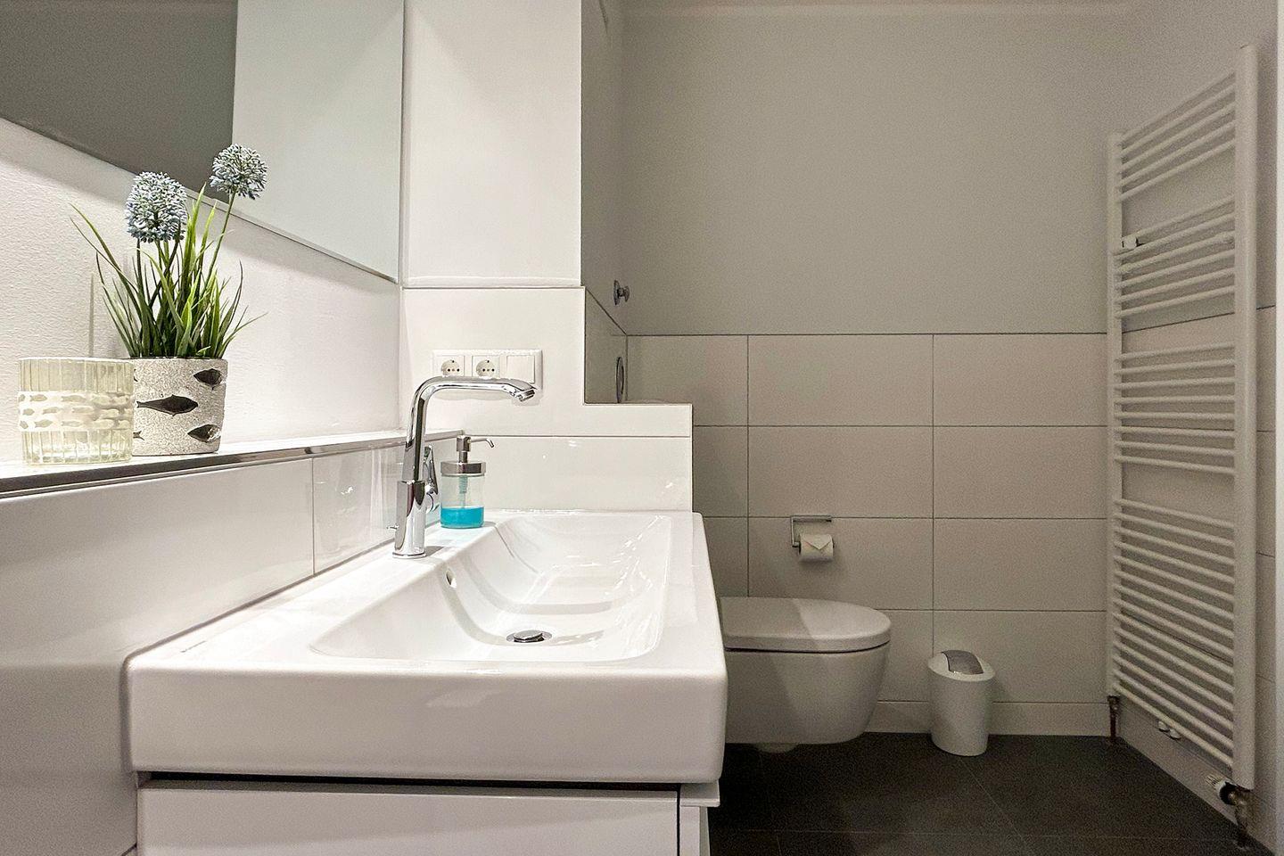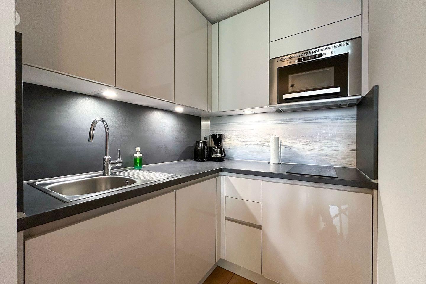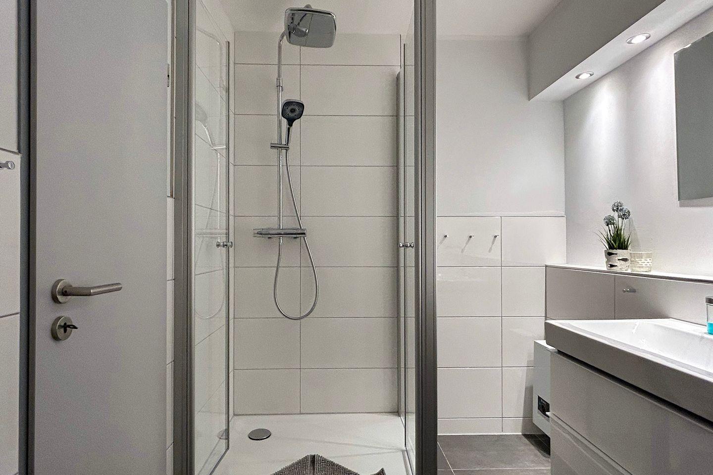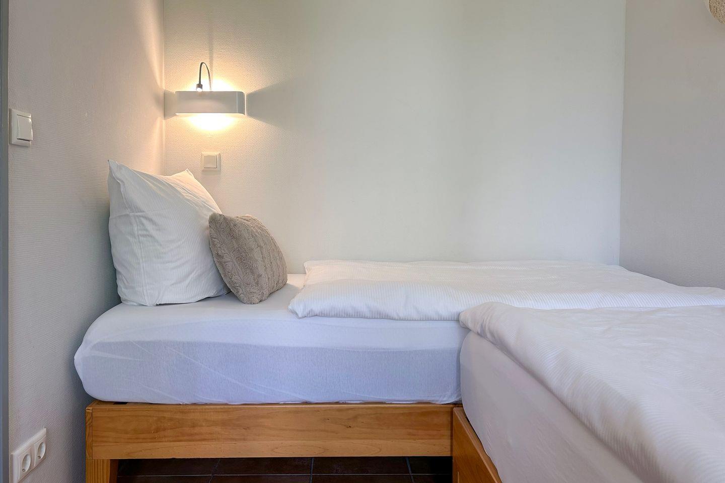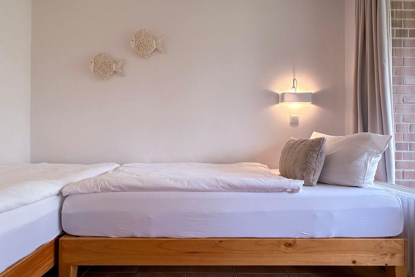Sie wohnen in unmittelbarer Strandnähe in einem schönen 2-Zimmer Appartement für bis zu 4 Personen mit überdachter Terrasse auf ca. 40 m² Wohnfläche. Das kleine Schlafzimmer mit getrennten Betten (ca. 90 x 190 cm) verfügt über einen eigenen Zugang zur Terrasse. Der Wohnraum ist ausgestattet mit einem bequemen Essplatz sowie einer Doppelbett-Schlafcouch mit eigener Matratze (160 x 200 cm Liegefläche). Ein modernes Duschbad, Einbauschränke im Eingangsbereich und ein bequem zugänglicher Tiefgaragenplatz (Durchfahrtshöhe: 190 cm) für Ihren PKW mit Fahrstuhl zur Wohnung runden das Angebot ab.