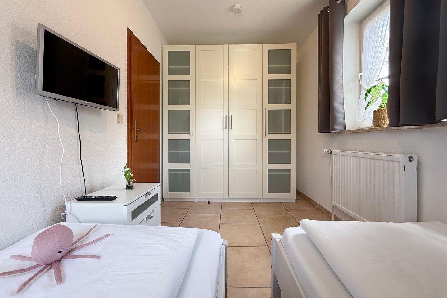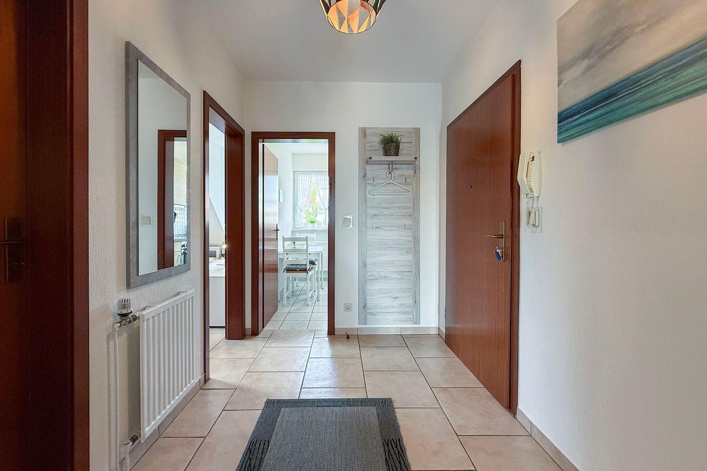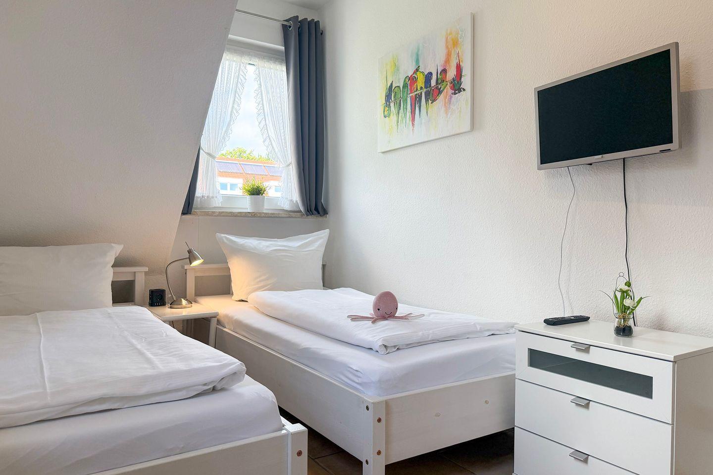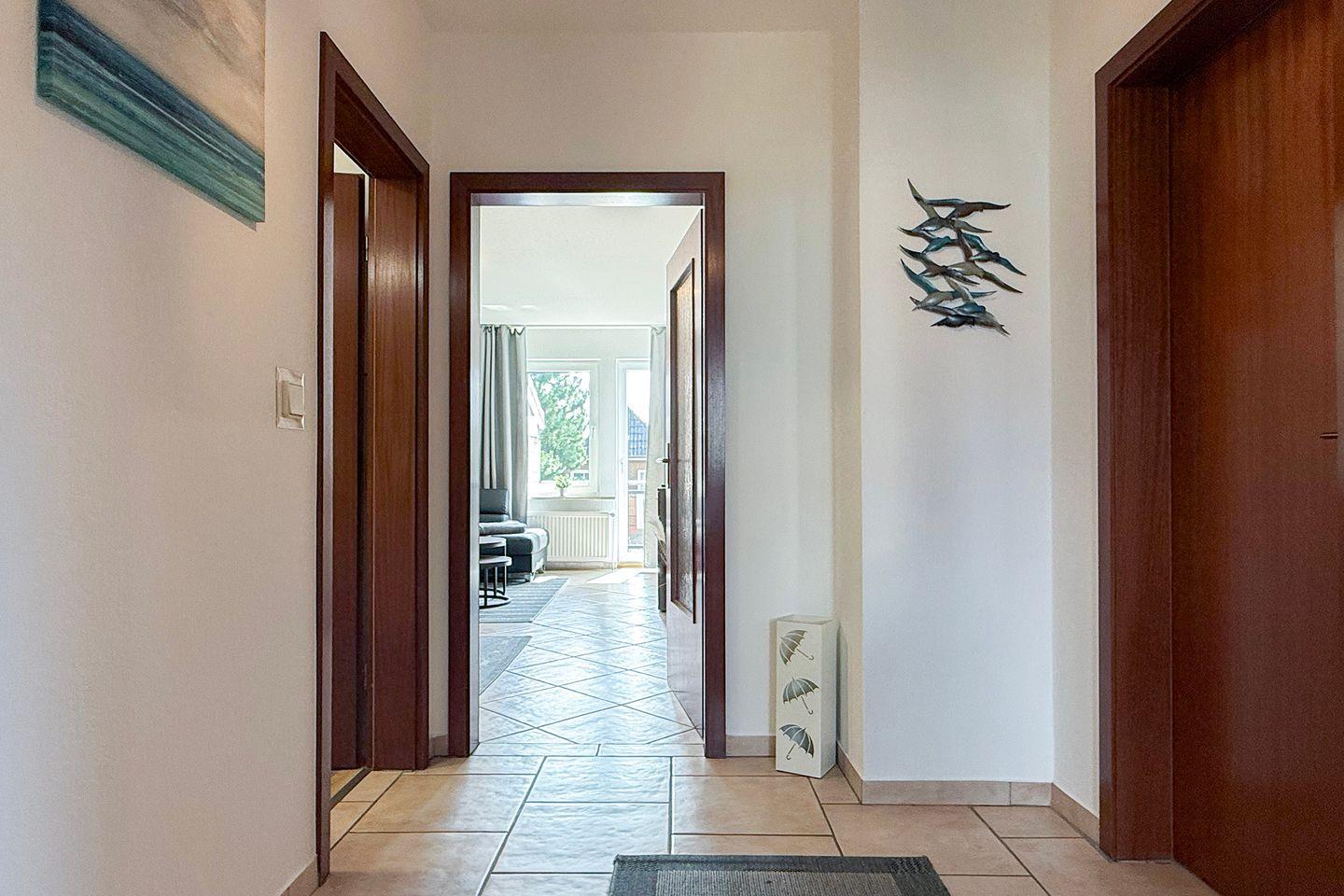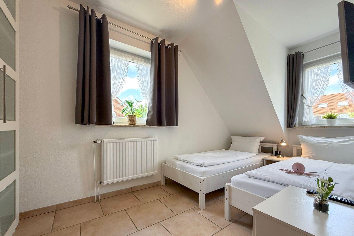 Die Landhaus Hubertus Ferienwohnung 2 bietet auf 68 m² mit zwei Schlafzimmern und einem Balkon komfortablen Raum für bis zu vier Personen. Zur Ausstattung gehören eine geschlossene Küche mit moderner Geräteausstattung, WLAN, Kabel-TV, eigener Parkplatz sowie Waschmaschinen- und Trocknernutzung. Einkaufsmöglichkeiten und Restaurants befinden sich direkt am Haus, der Sandstrand ist nur 600 Meter entfernt.