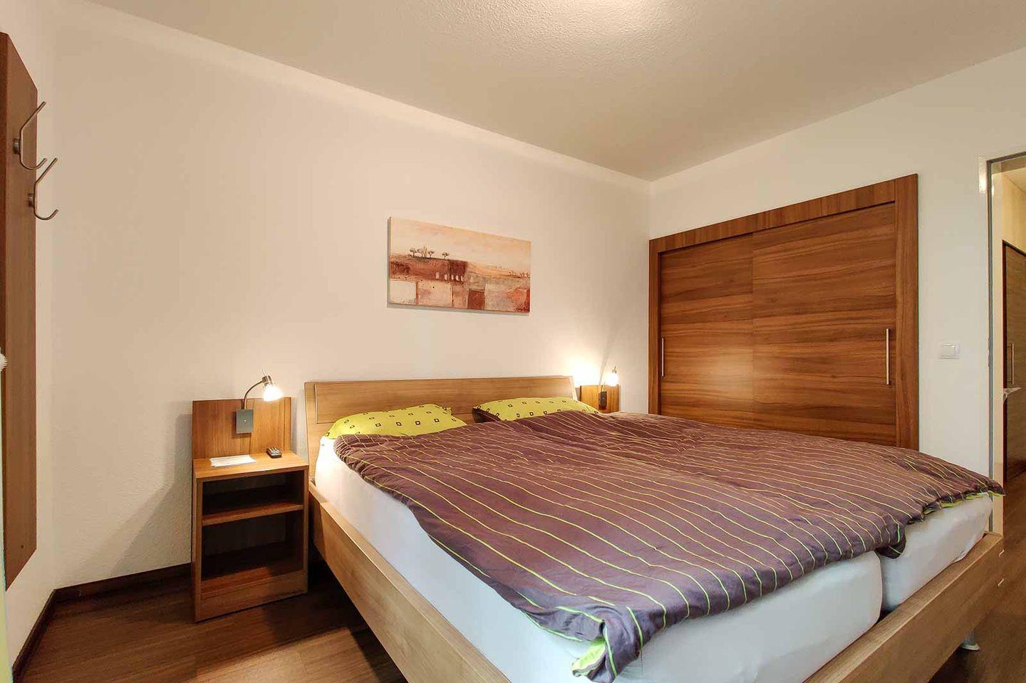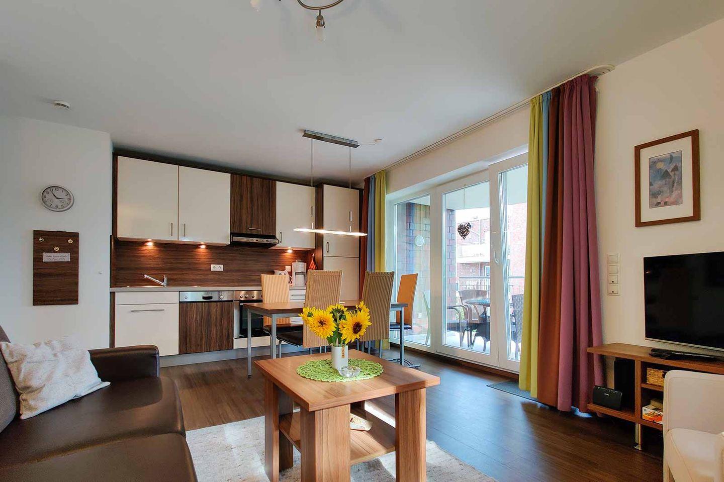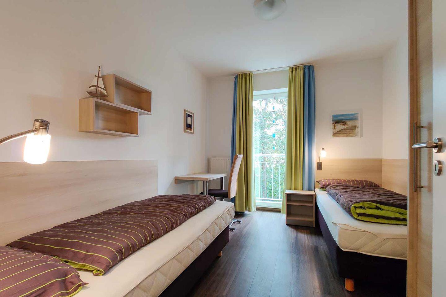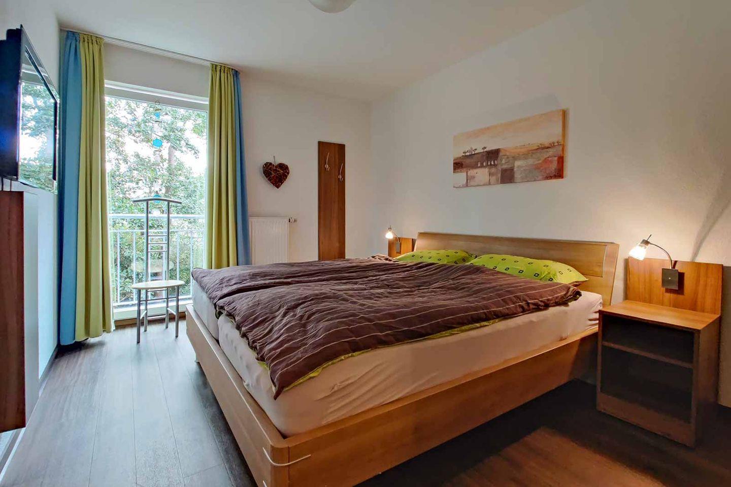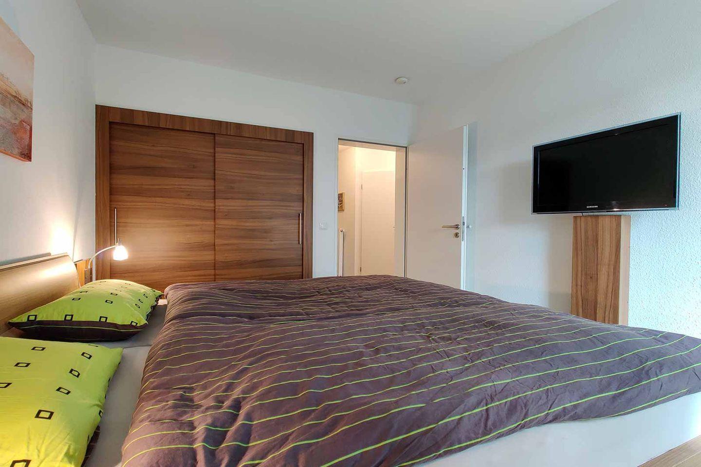 Eines der zwei Schlafzimmer ist ausgestattet mit einem Doppelbett und LCD-TV, das andere Schlafzimmer verfügt über zwei getrennte Betten. Vom Wohnraum mit offener Küche, Essplatz und Schlafsofa haben Sie Zugang zu einem großen und einem kleinen Balkon. Besonders wertvoll beim Urlaub mit mehreren Mitreisenden: Zur Wohnung gehört nicht nur ein Badezimmer mit Dusche, sondern auch ein separates Gäste-WC. In der Tiefgarage ist ein Parkplatz für Sie reserviert. Fahrräder können im abschließbaren Fahrradraum untergebracht werden.