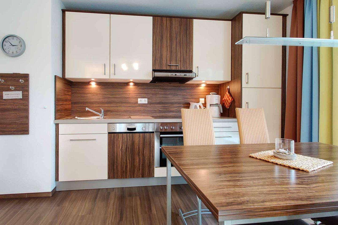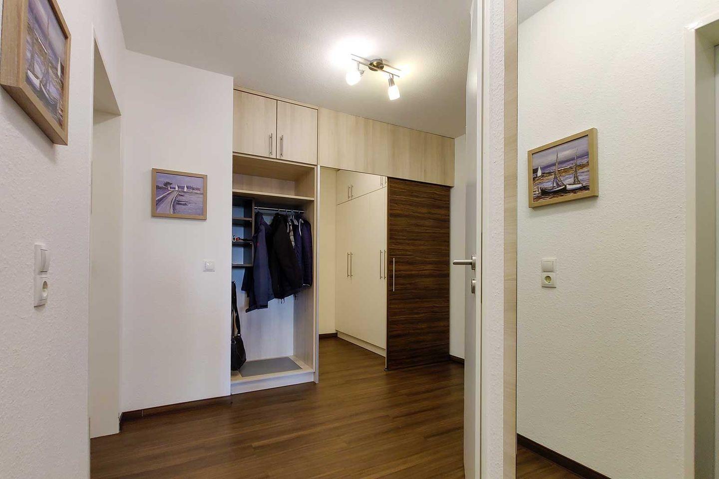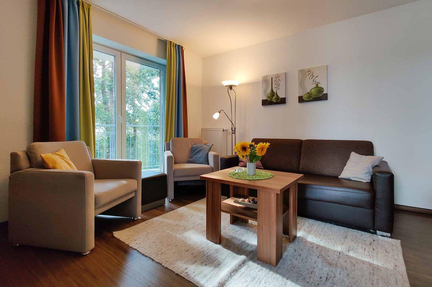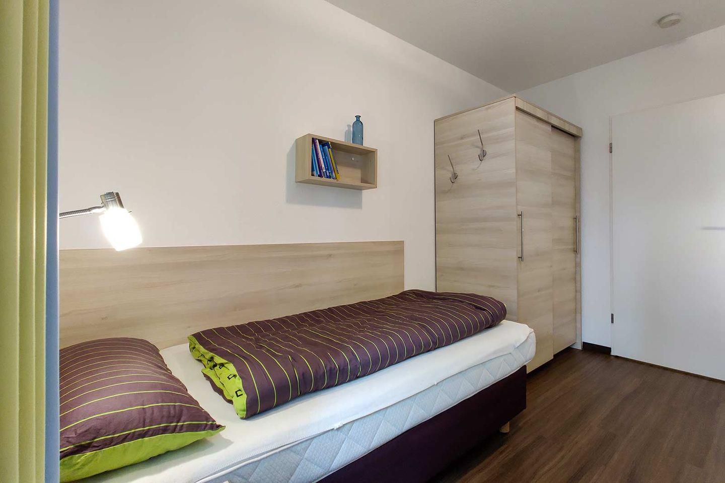 Eines der zwei Schlafzimmer ist ausgestattet mit einem Doppelbett und LCD-TV, das andere Schlafzimmer verfügt über zwei getrennte Betten. Vom Wohnraum mit offener Küche, Essplatz und Schlafsofa haben Sie Zugang zu einem großen und einem kleinen Balkon. Besonders wertvoll beim Urlaub mit mehreren Mitreisenden: Zur Wohnung gehört nicht nur ein Badezimmer mit Dusche, sondern auch ein separates Gäste-WC. In der Tiefgarage ist ein Parkplatz für Sie reserviert. Fahrräder können im abschließbaren Fahrradraum untergebracht werden.