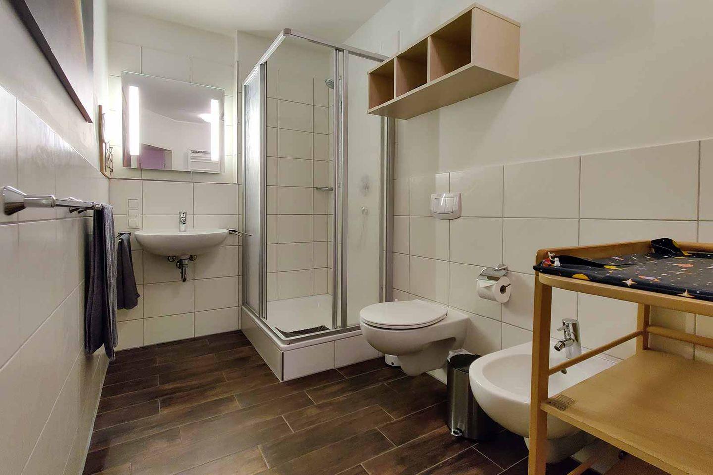 Die Wohnung befindet sich im ersten Stock eines vierstöckigen Gebäudes und ist bequem über einen Aufzug zu erreichen. Sie verfügt über insgesamt drei Zimmer, darunter zwei gemütliche Schlafzimmer, die Platz für bis zu vier Personen bieten. Ihr Wohnbereich ist hell und einladend gestaltet, mit einem modernen Vinylboden, der eine angenehme Atmosphäre schafft. Eine Spielekonsole (Nintendo Wii), ein TV-Gerät sowie eine Auswahl an DVDs und Spielen sorgen für abwechslungsreiche Unterhaltung an entspannten Abenden.