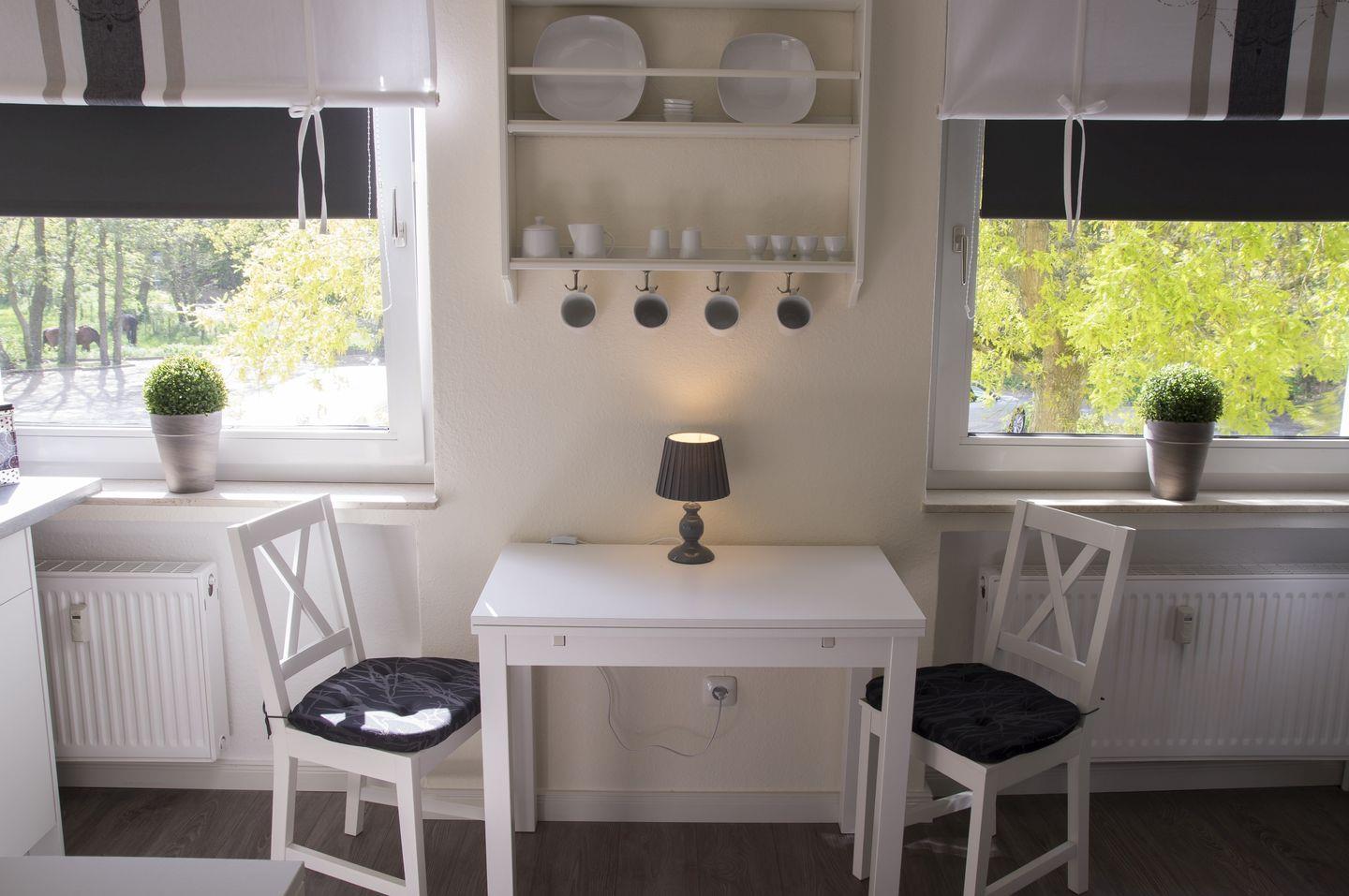 In dem hellen Wohnbereich finden Sie einen gemütlichen Sessel sowie einen Esstisch, an dem Sie gemeinsam speisen oder einen Spieleabend genießen können.