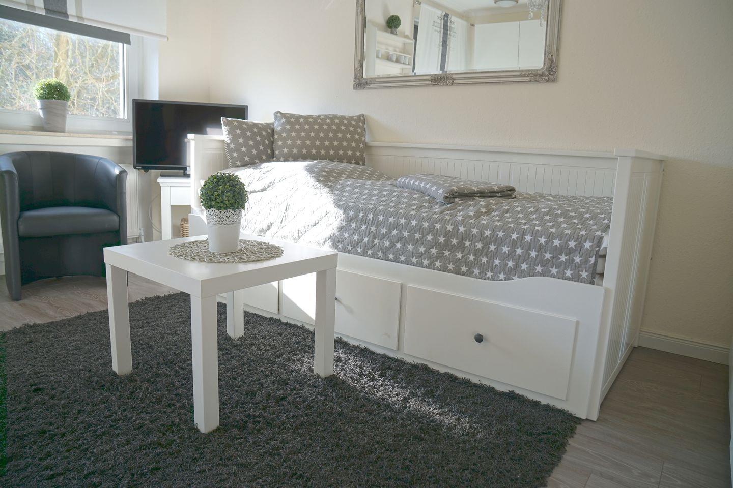 Das Tagesbett lässt sich mit wenigen Handgriffen zu einem großen Bett (160cm) umwandeln. Die Promenade ist nur ca. 300m vom Haus entfernt.