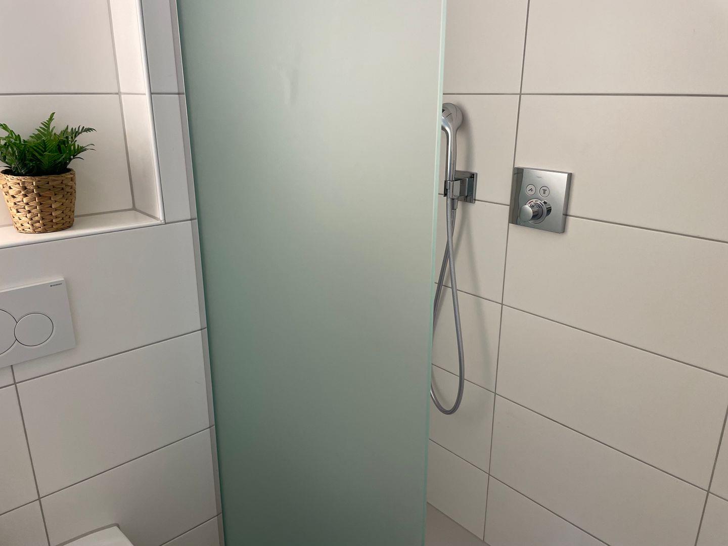 Das Badezimmer verfügt über eine bodengleiche Dusche, die Ihnen täglichen Komfort bietet.