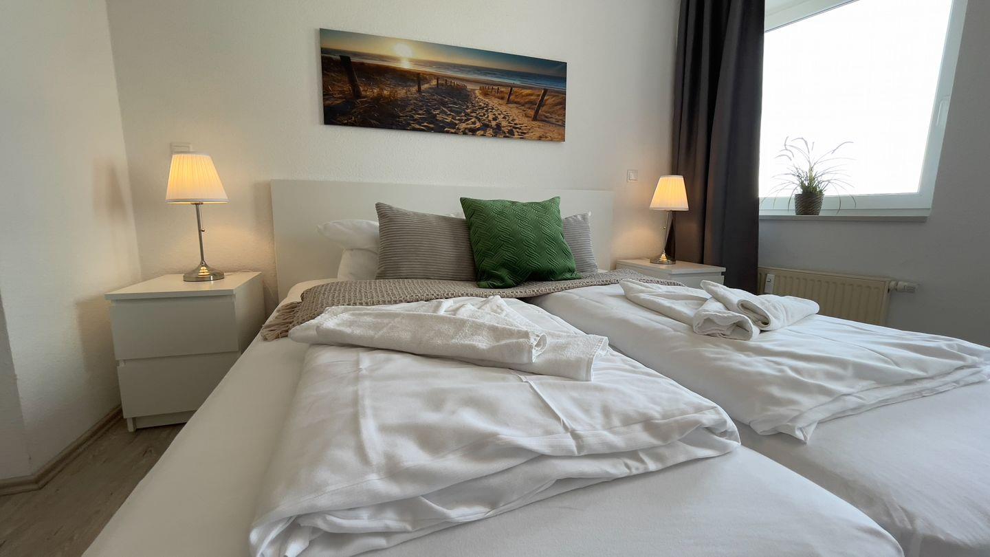 Die Wohnung verfügt über 2 separate Schlafzimmer, eines mit großem Doppelbett, das andere mit einem Einzelbett und einem Etagenbett. Zwei weitere Personen finden Platz auf dem ausklappbaren Schlafsofa im gemütlichen Wohnbereich.
