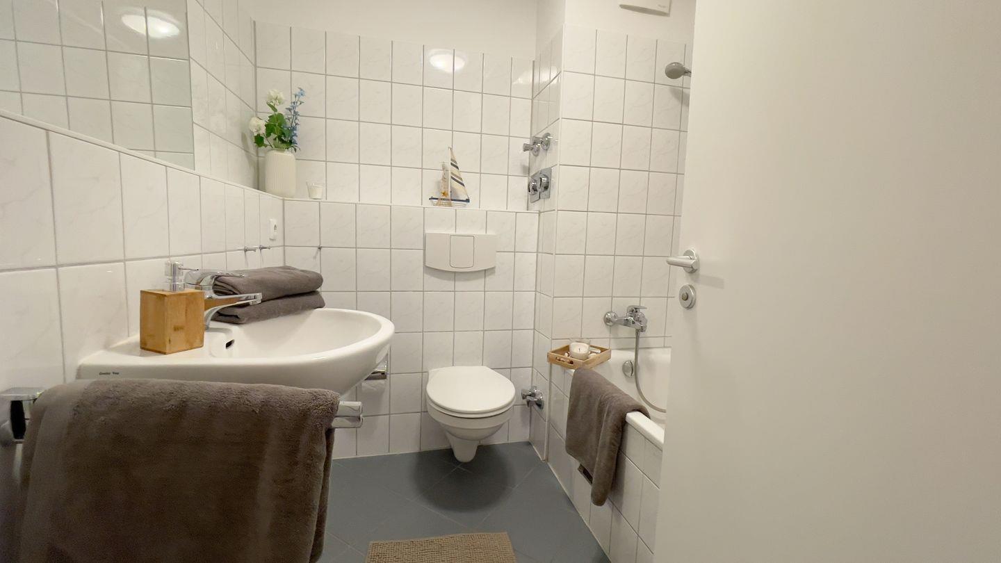 Das Badezimmer ist mit einer Badewanne und Duschfunktion ausgestattet. Hier können Sie nach einem Strandtag ein Bad nehmen und den erholsamen Urlaubstag ausklingen lassen.