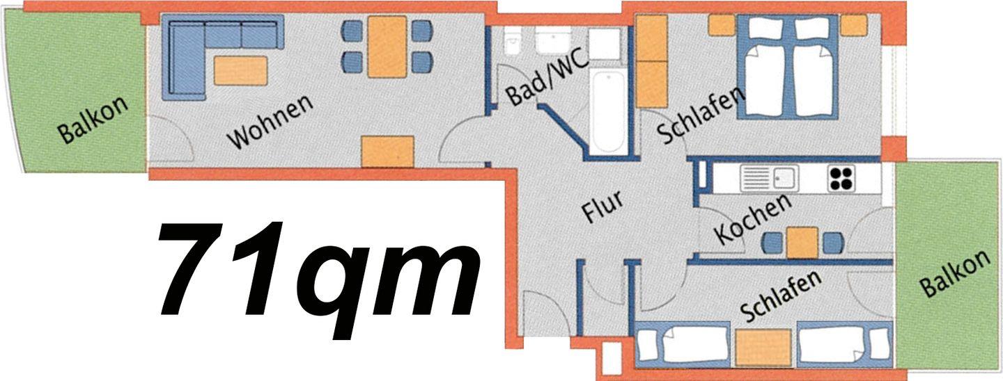 Sie ist ca. 71qm groß, für bis zu 6 Personen ausgestattet und liegt in der 1. Etage (Aufzug vorhanden). Zur Promenade und zum Sandstrand sind ca. 200 Meter.
