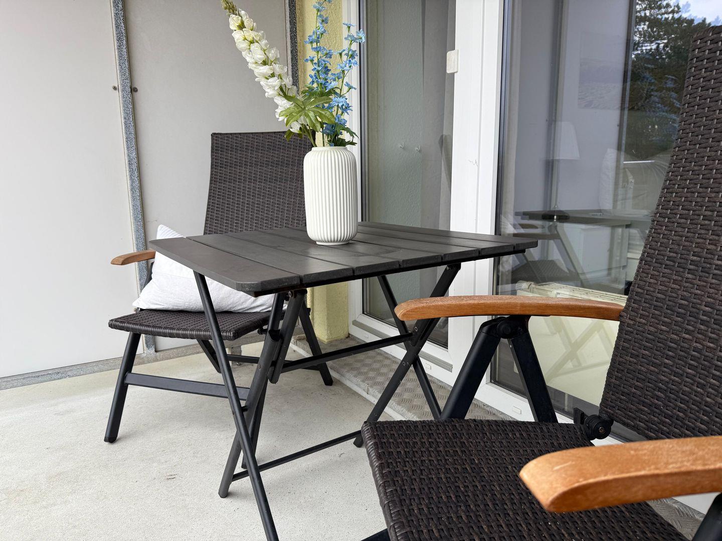 Genießen Sie die frische Seeluft auf dem möblierten Balkon mit seitlichem Meerblick.