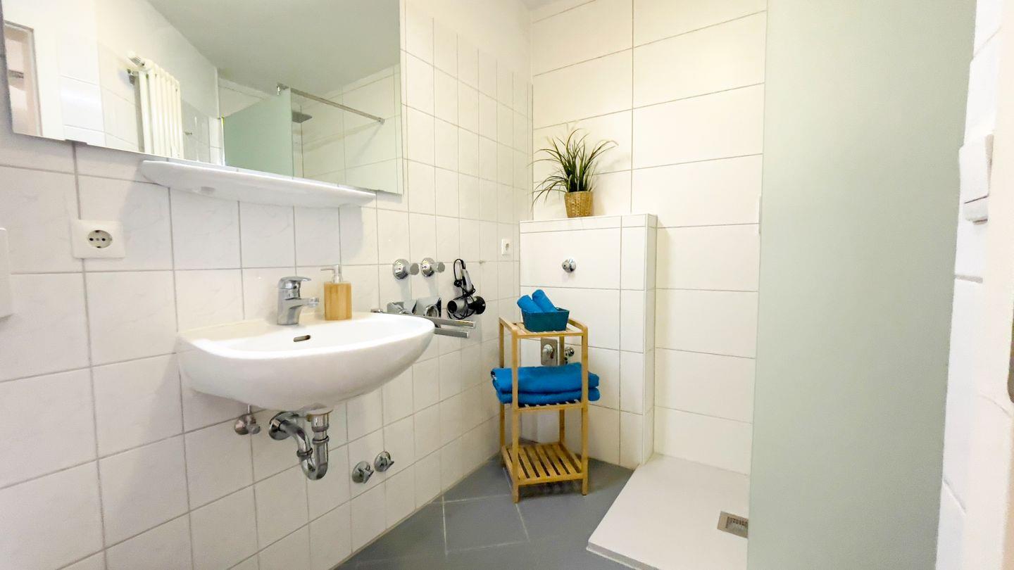 Das Schlafsofa im Wohnbereich bietet zwei weiteren Personen einen Schlafplatz. Das Bad mit ebenerdiger Dusche rundet die Ausstattung der Wohnung ab.