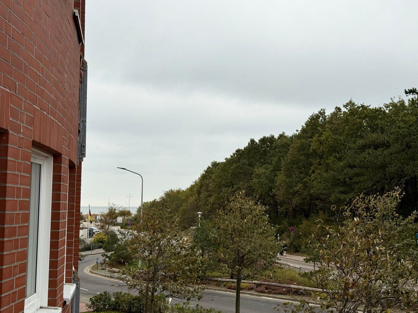 Genießen Sie die frische Seeluft auf dem möblierten Balkon mit Blick ins Grüne und etwas seitlichem Meerblick.
