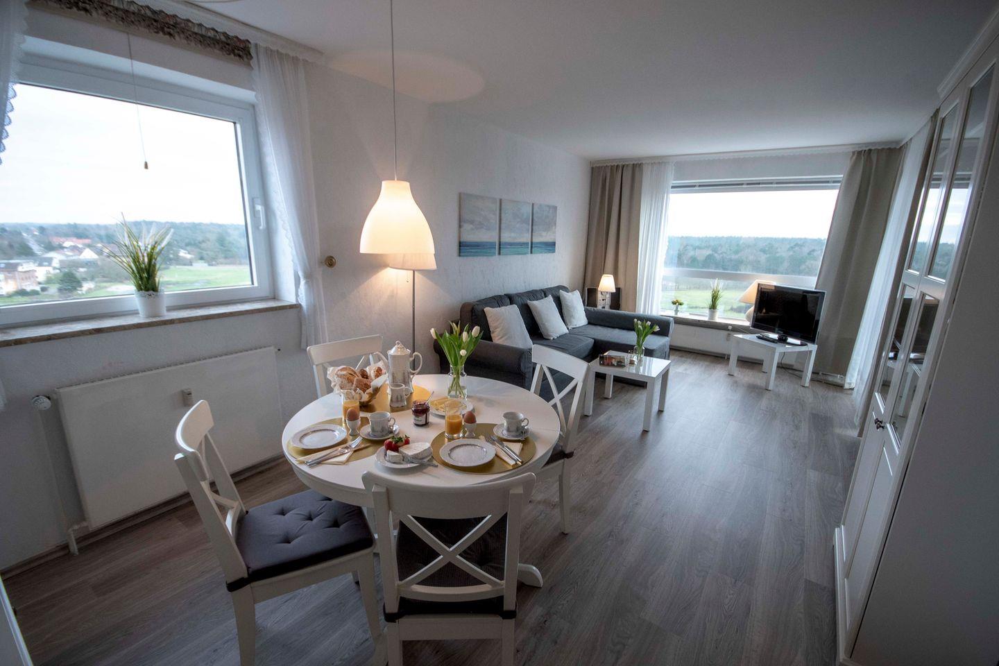Die Ferienwohnung überzeugt durch ihre durchdachte Ausstattung und moderne Einrichtung. Sie betreten die Wohnung und finden sich in einem einladenden Wohnbereich mit gemütlicher Sofaecke und einem Essbereich wieder, der genug Platz für gemeinsame Mahlzeiten bietet. Die Küche ist vollständig ausgestattet und bietet einen 4-Platten-Herd, Backofen, Kühlschrank mit Gefrierfach, sowie alle nötigen Küchenutensilien. Hier bereiten Sie im Handumdrehen leckere Mahlzeiten zu.