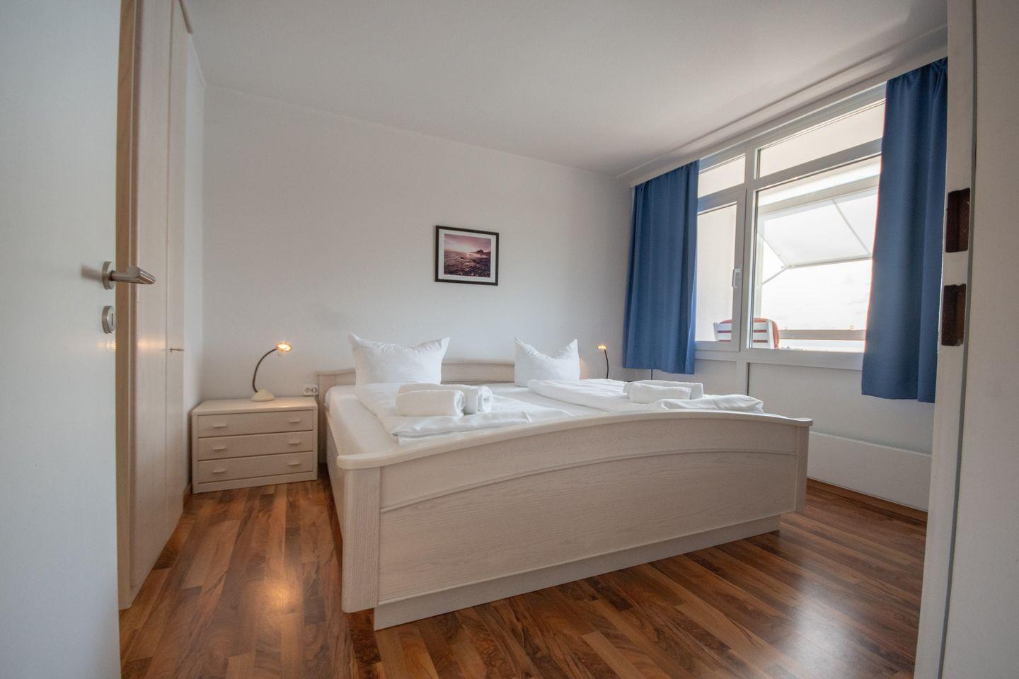 Das separate Schlafzimmer ist mit einem Doppelbett und einem Fernseher ausgestattet.