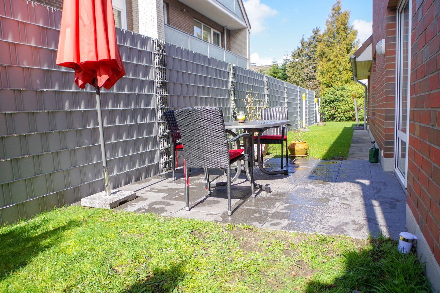 Gemütliche 47-m²-Ferienwohnung im Erdgeschoss mit separatem Schlafzimmer und großer Terrasse. Ideal für Paare oder Familien. Der Gemeinschaftsgarten darf mit genutzt werden und der Strand ist nur 5 Gehminuten entfernt.