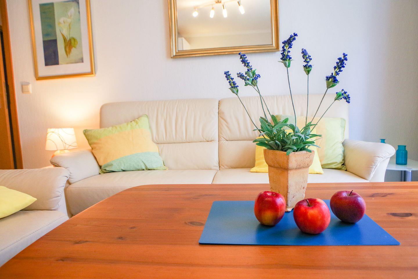 Neben einem separaten Schlafzimmer steht im Wohnbereich ein komfortables Klappbett zur Verfügung. Die gut ausgestattete Küchenzeile bietet u. a. Backofen, Cerankochfeld, Wasserkocher und Kaffeemaschine – perfekt für entspannte Mahlzeiten in eigener Regie.