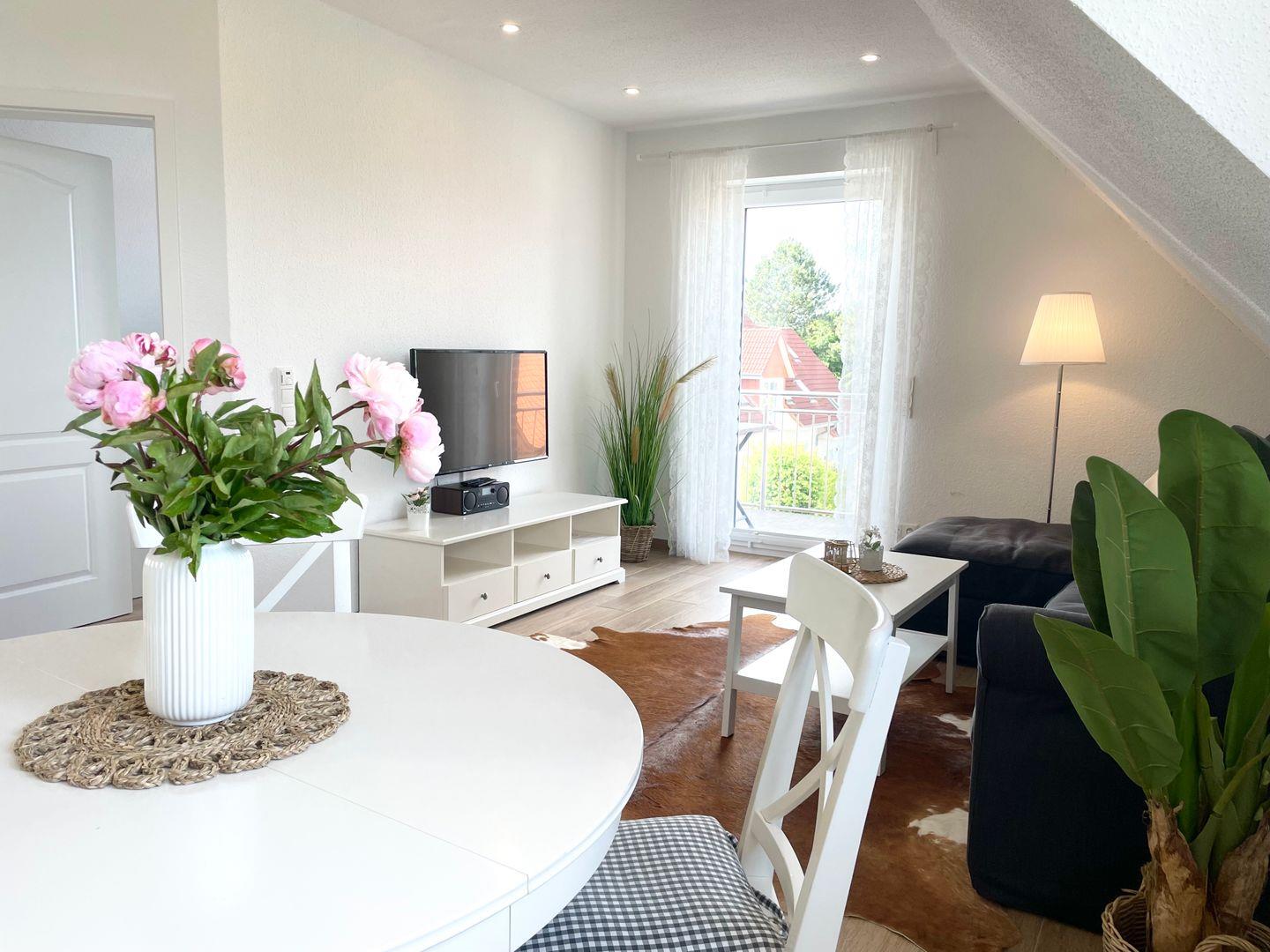 Im separaten Schlafzimmer mit Doppelbett sowie im Wohnzimmer ist jeweils ein großer Flachbildfernseher vorhanden. Ein Gefühl von Gemütlichkeit wird von den hellen und freundlichen Möbel vermittelt, mit denen die Ferienwohnung ausgestattet ist.