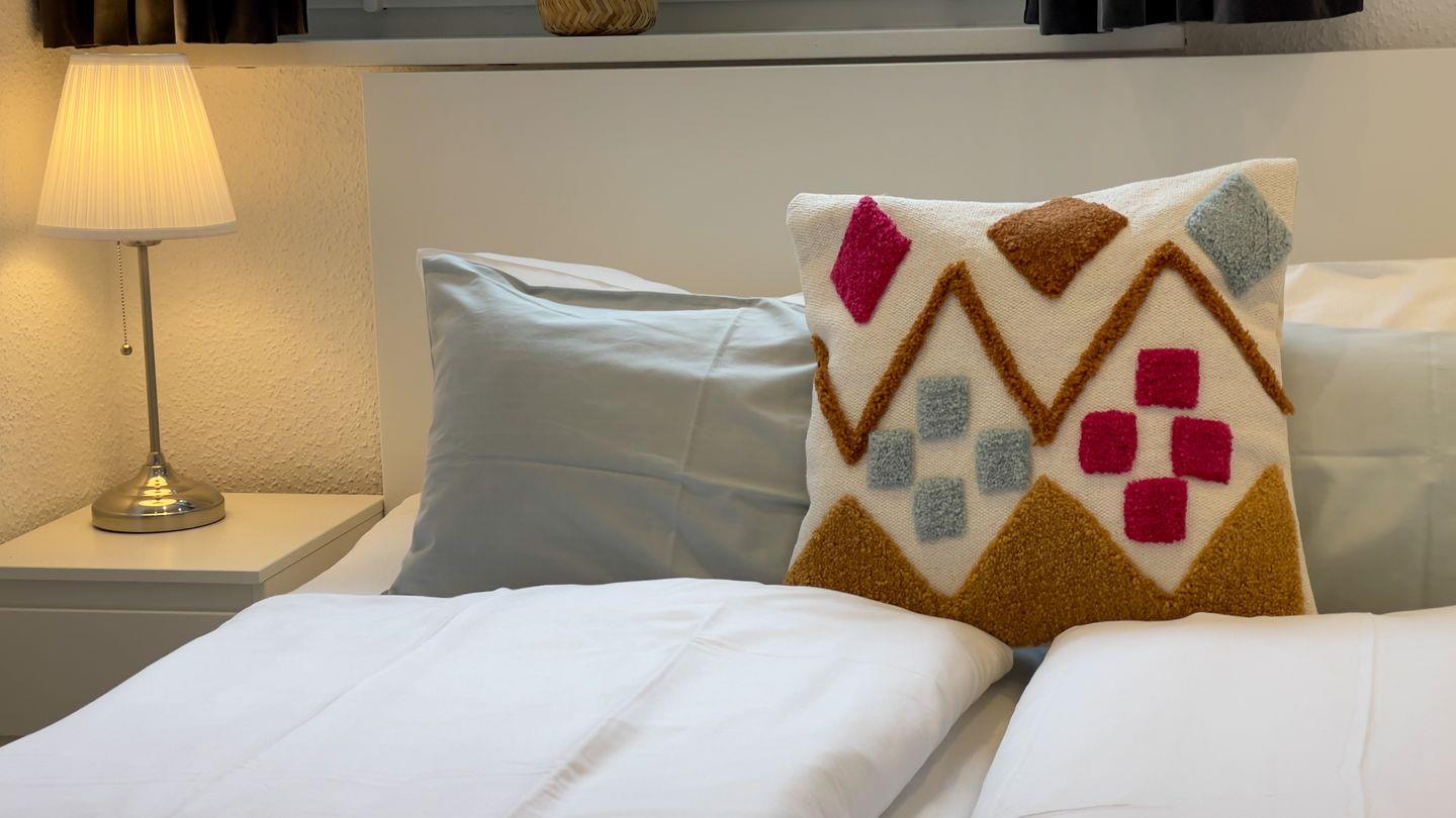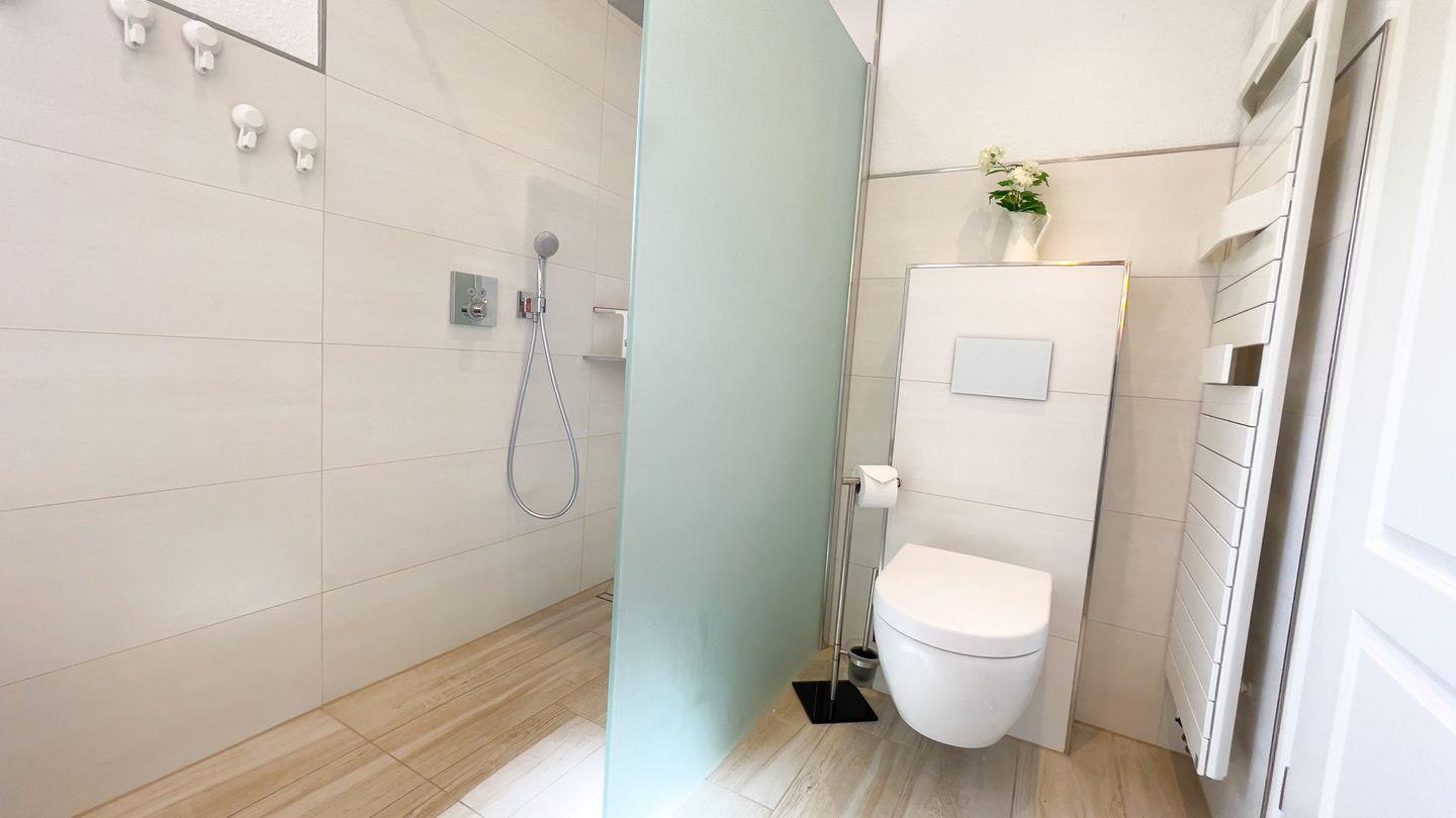 Die Wohnung verfügt über zwei gemütliche Schlafzimmer, in denen Sie nach einem erlebnisreichen Tag entspannen können. Für zusätzlichen Komfort gibt es ein Gäste-WC und ein modernes Badezimmer mit bodengleicher Dusche sowie einer Badewanne mit Whirlpool-Funktion, perfekt für erholsame Abende. Ein großer Wohnzimmerbereich mit Sofa und TV sorgt für gemütliche Stunden, während Sie miteinander plaudern oder einen Filmabend genießen können.