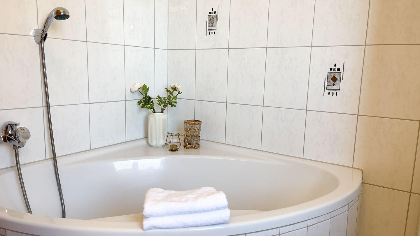 Das Bad verfügt neben einer großen Eckbadewanne auch über eine Duschkabine. Im Erdgeschoss befindet sich ein weiteres Gäste-WC.