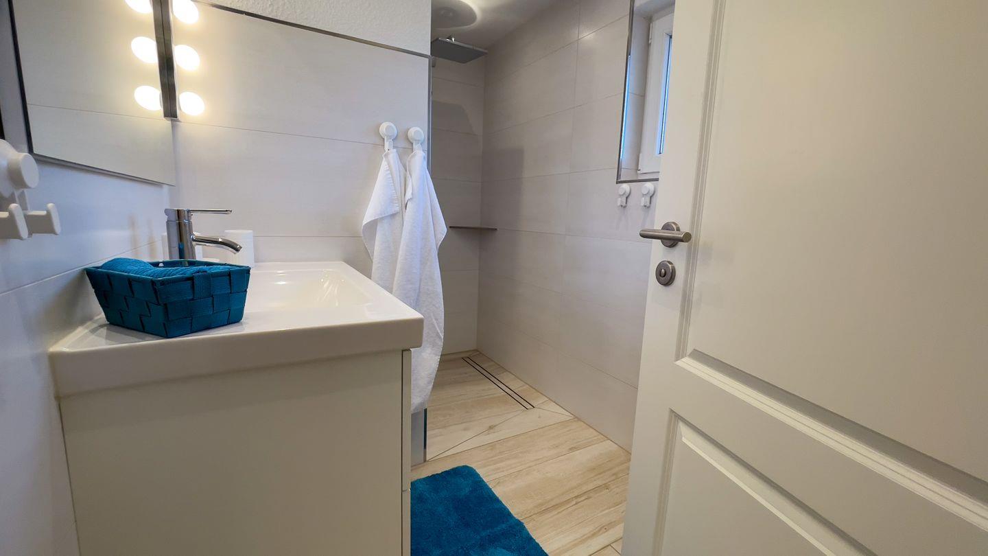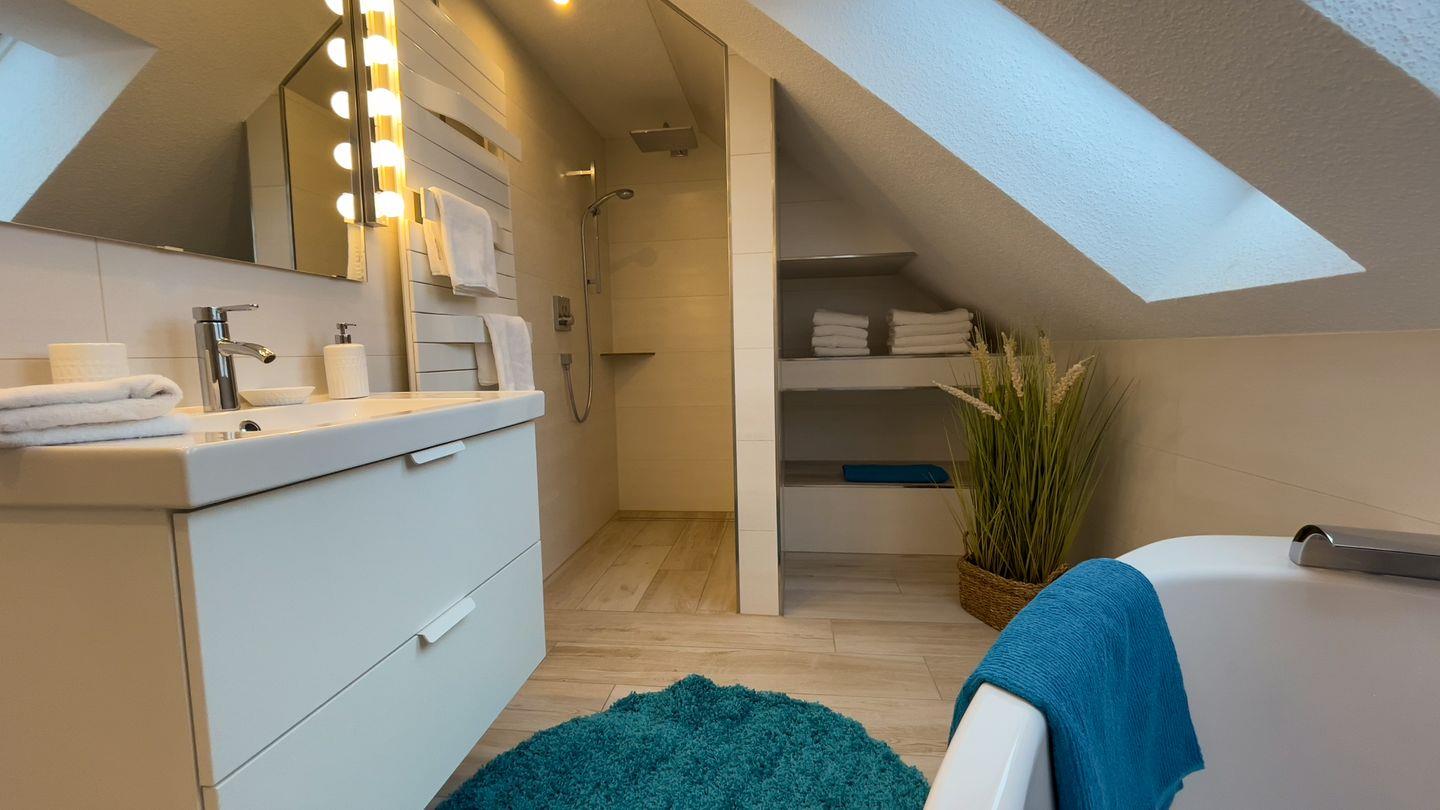 Bädern mit jeweils einer Walk-In Dusche sowie einer Whirlpool-Badewanne im oberen Bad. Ebenso gibt es eine Sauna in der Wohnung für die kälteren Schietwetter-Tage.