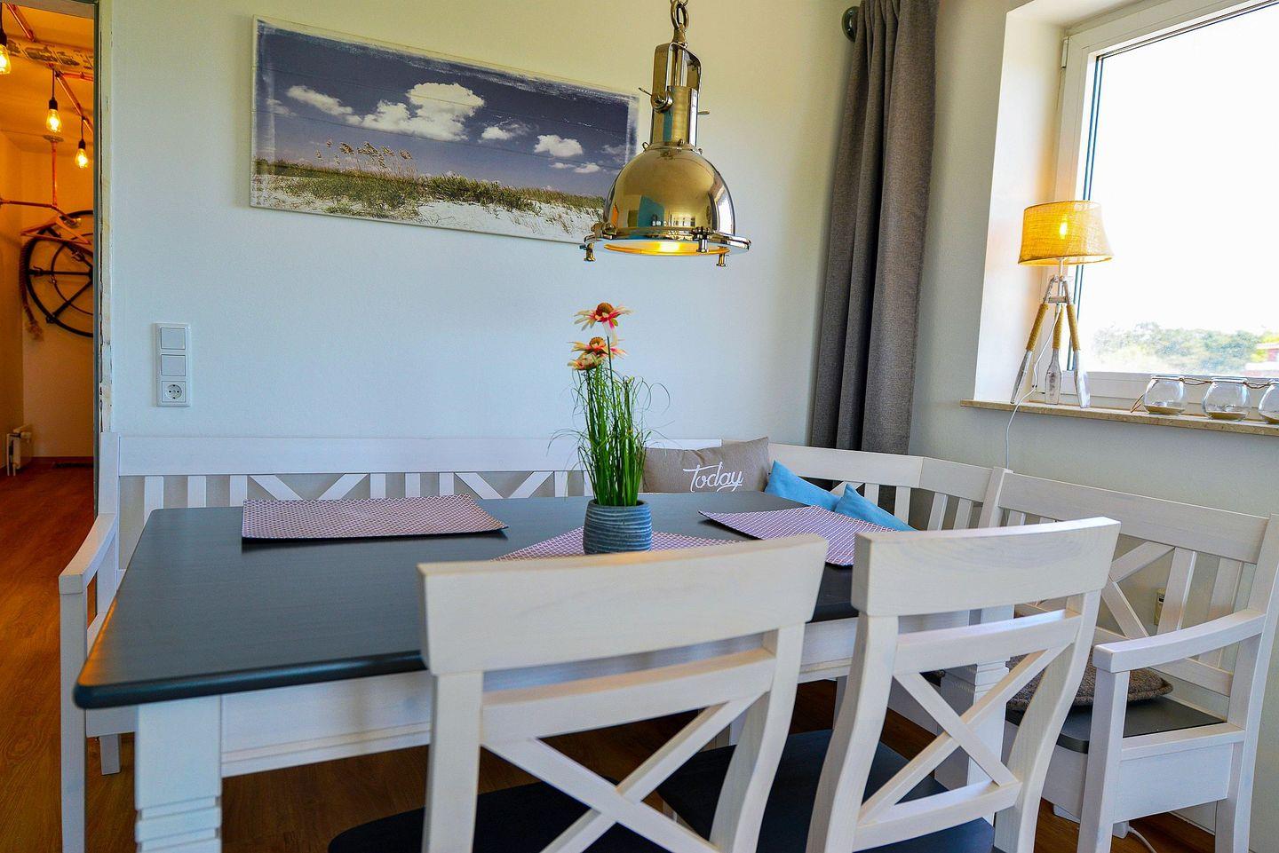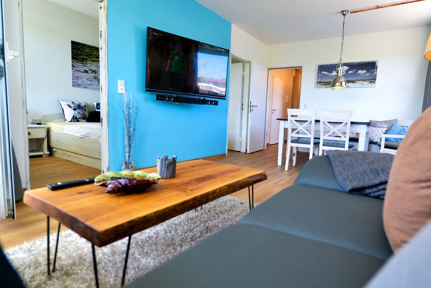 Verbringen Sie einen wunderbaren Nordseeurlaub in dieser stilvollen und 60m² großen Ferienwohnung für 4 Personen. Von der vollausgestatteten Küche, über den hellen Wohnraum mit großem WLAN-fähigen 55 Zoll Flatscreen TV und Sound System (weiterer WLAN-fähiger 43" TV in einem der Schlafzimmer), bis hin zum neuen Bad mit Badewanne ist diese Ferienwohnung auf Wohlfühlen mit tollem Ambiente an der Nordsee zugeschnitten.