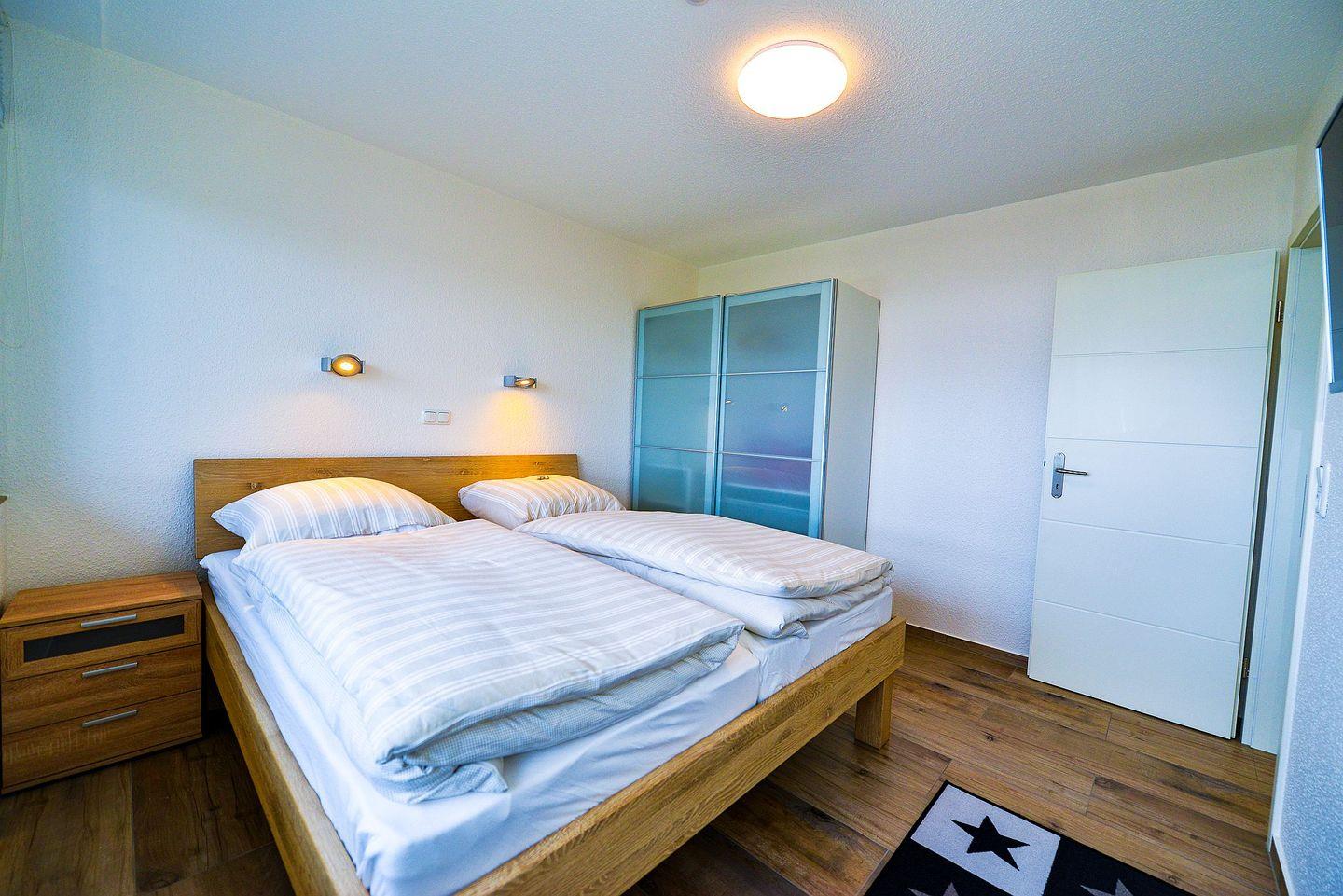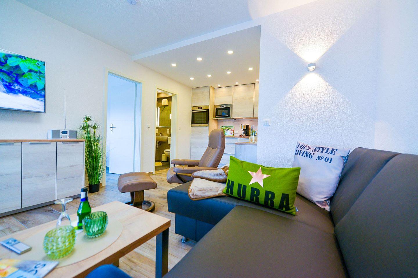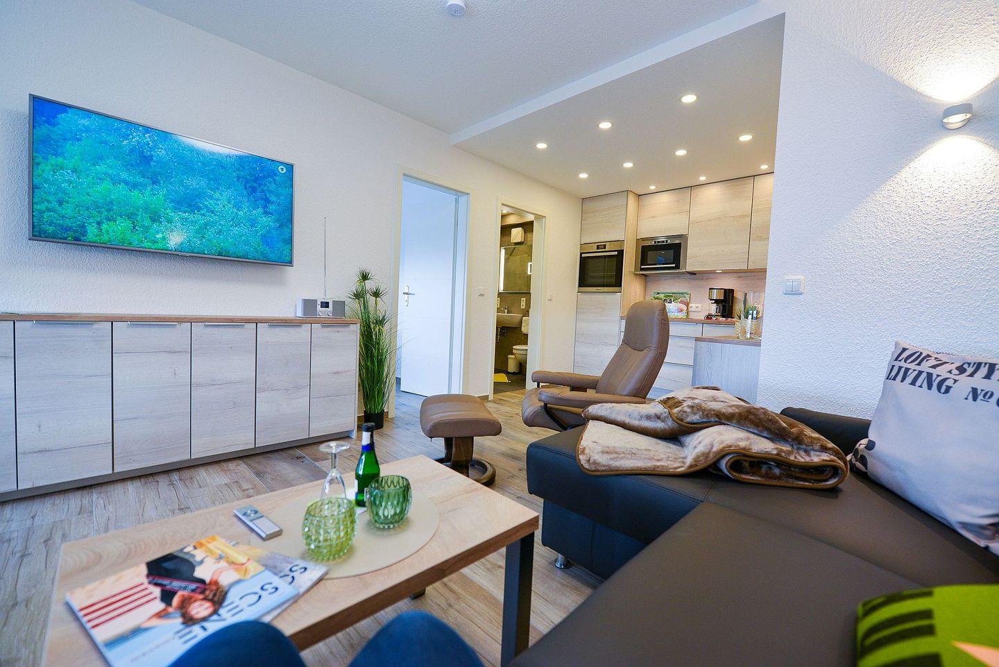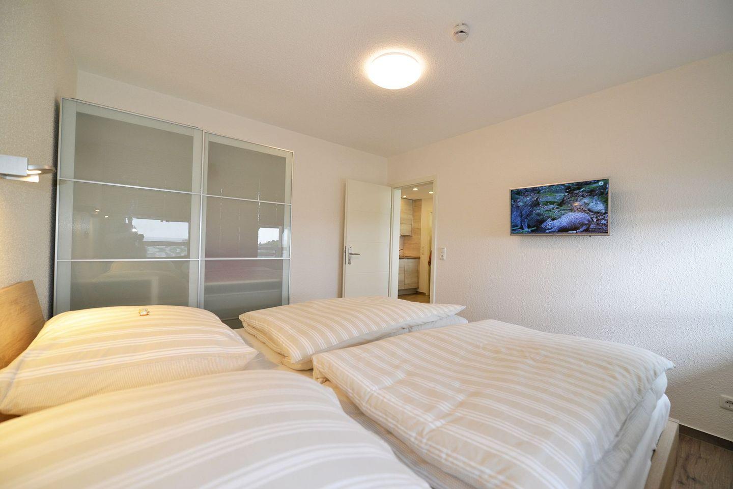 Der lichtdurchflutete Wohnbereich ist mit einer gemütlichen Sitzecke, einem Essplatz und einem Flatscreen-TV ausgestattet. Die gut ausgestattete Küchenzeile bietet alles, was Sie für die Selbstverpflegung benötigen – von Kaffeemaschine über Mikrowelle bis zum Kochfeld. Im separaten Schlafzimmer erwartet Sie ein komfortables Doppelbett und ein weiterer Fernseher, sodass Sie auch vom Bett aus entspannt fernsehen können. Das moderne Bad mit Dusche ist gepflegt und funktional. Der Westbalkon bietet zusätzlich schöne Sicht auf das Meer und lädt zu ruhigen Stunden mit Weitblick ein.