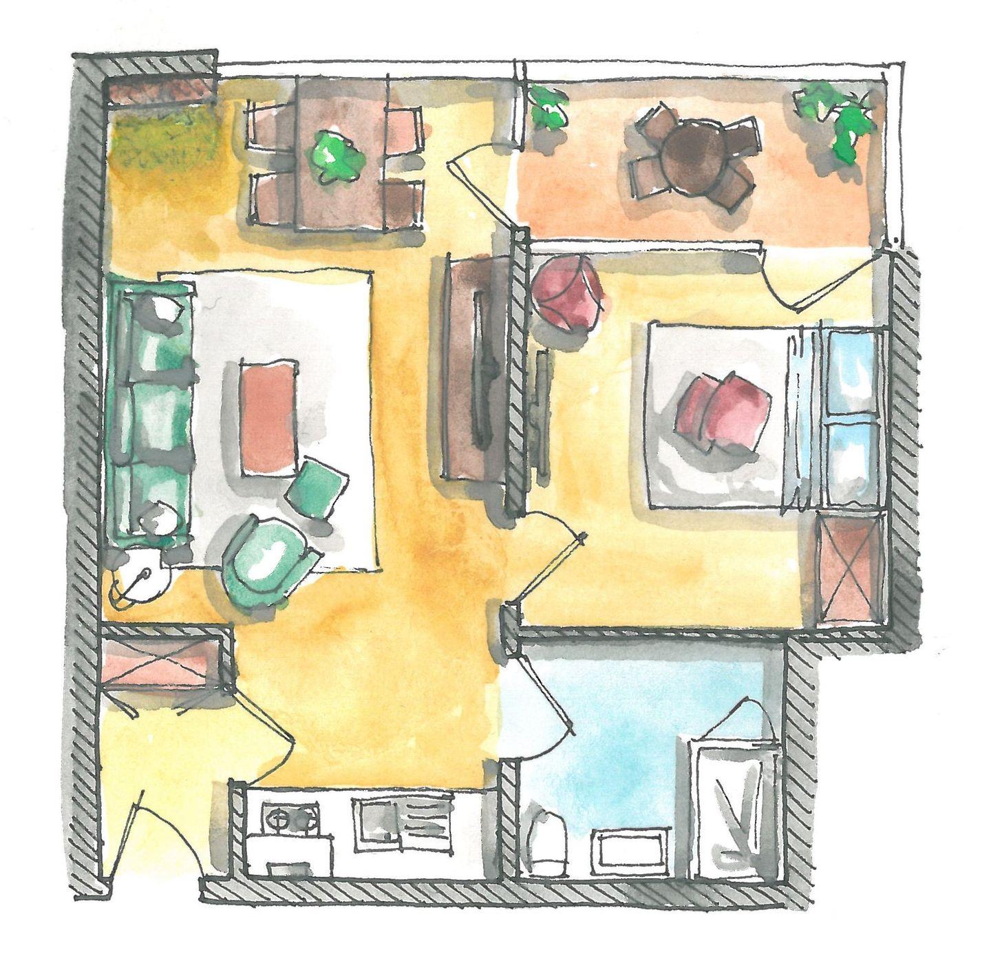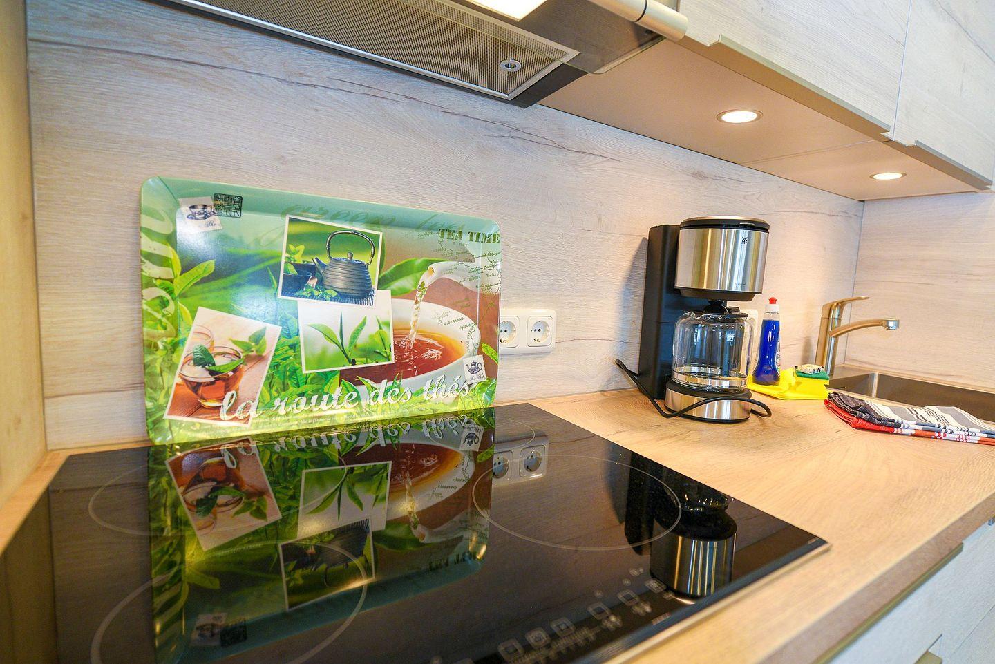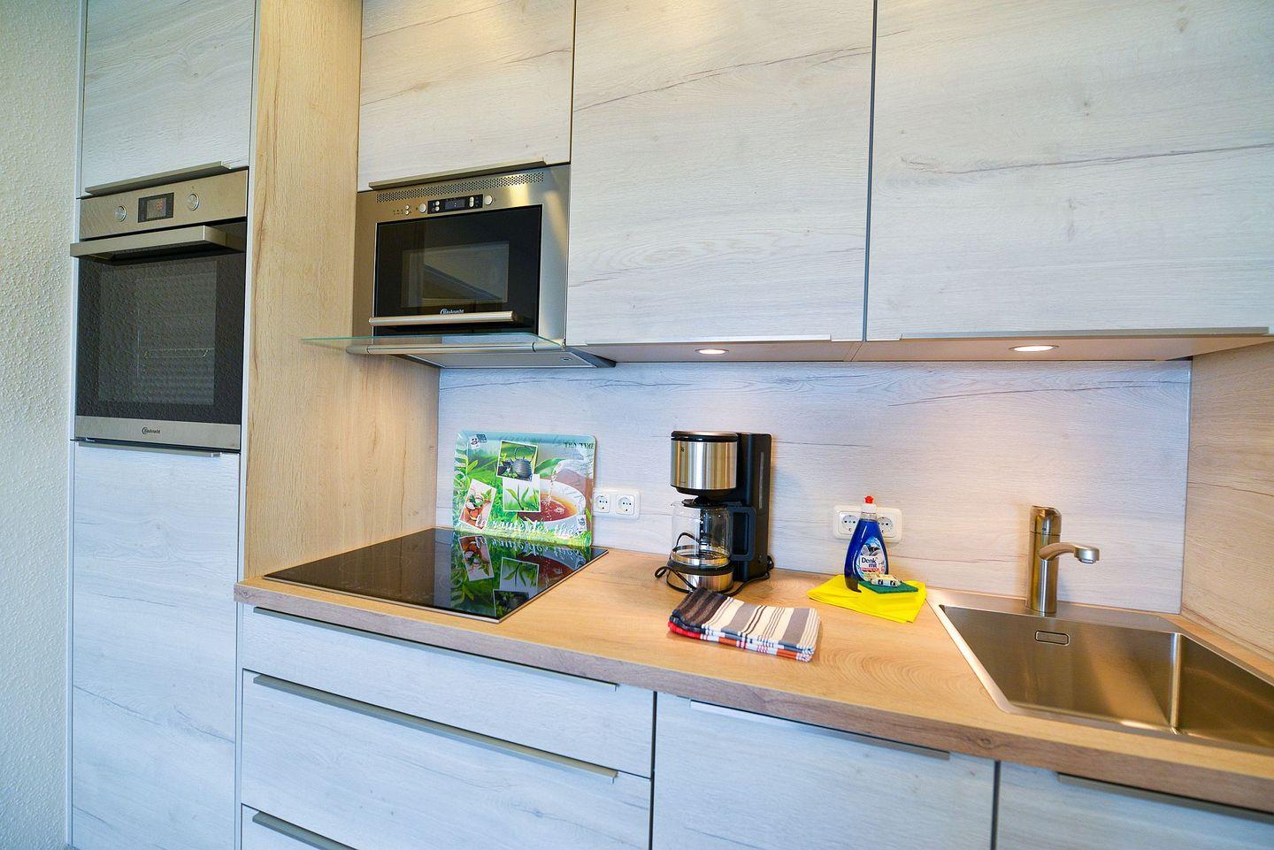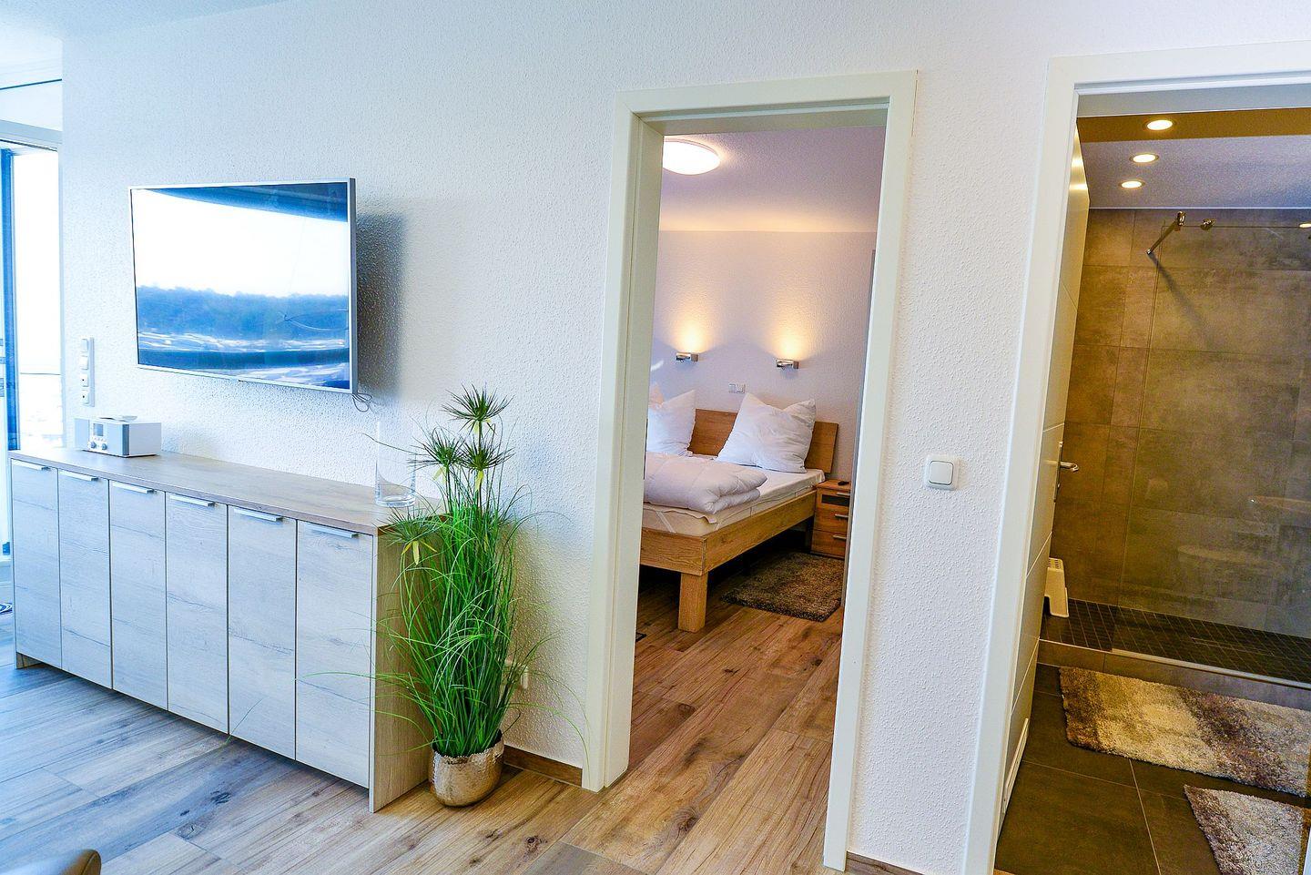 Der lichtdurchflutete Wohnbereich ist mit einer gemütlichen Sitzecke, einem Essplatz und einem Flatscreen-TV ausgestattet. Die gut ausgestattete Küchenzeile bietet alles, was Sie für die Selbstverpflegung benötigen – von Kaffeemaschine über Mikrowelle bis zum Kochfeld. Im separaten Schlafzimmer erwartet Sie ein komfortables Doppelbett und ein weiterer Fernseher, sodass Sie auch vom Bett aus entspannt fernsehen können. Das moderne Bad mit Dusche ist gepflegt und funktional. Der Westbalkon bietet zusätzlich schöne Sicht auf das Meer und lädt zu ruhigen Stunden mit Weitblick ein.