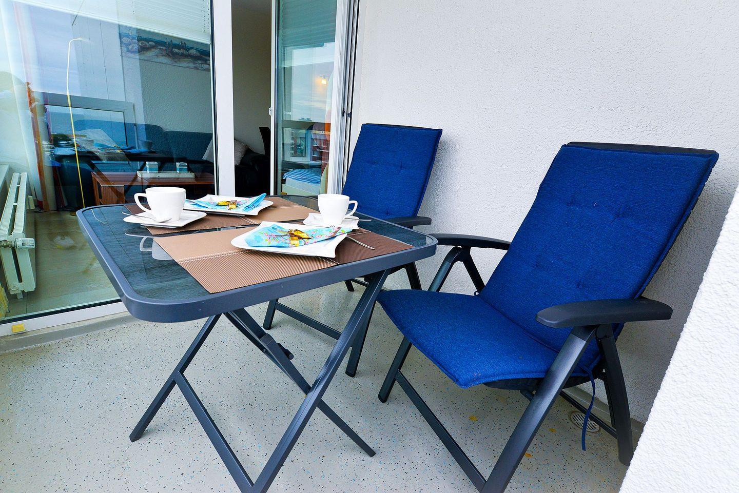 Entspannte Stunden auf dem Balkon mit Seesicht, der Urlauber dazu einlädt den Tag, nach den schönen Stunden am Strand, gemütlich ausklingen zu lassen.