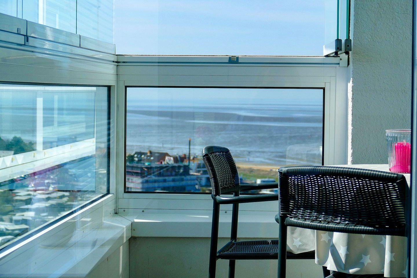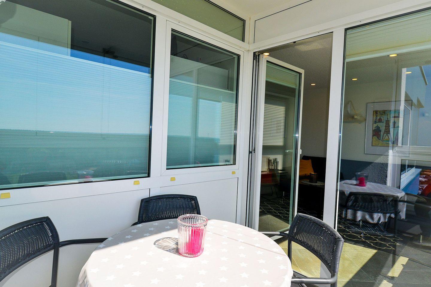 Für die Zeit nach langen Strandtagen bietet sich der verglaste Südbalkon dazu an, den Abend an der Meeresluft ausklingen und die Blicke, vom 14. Stock aus, über das Meer schweifen zu lassen.