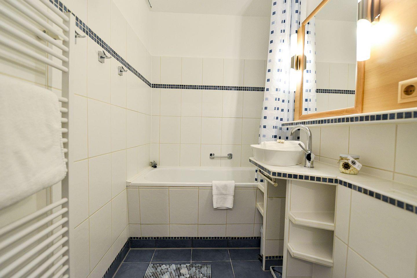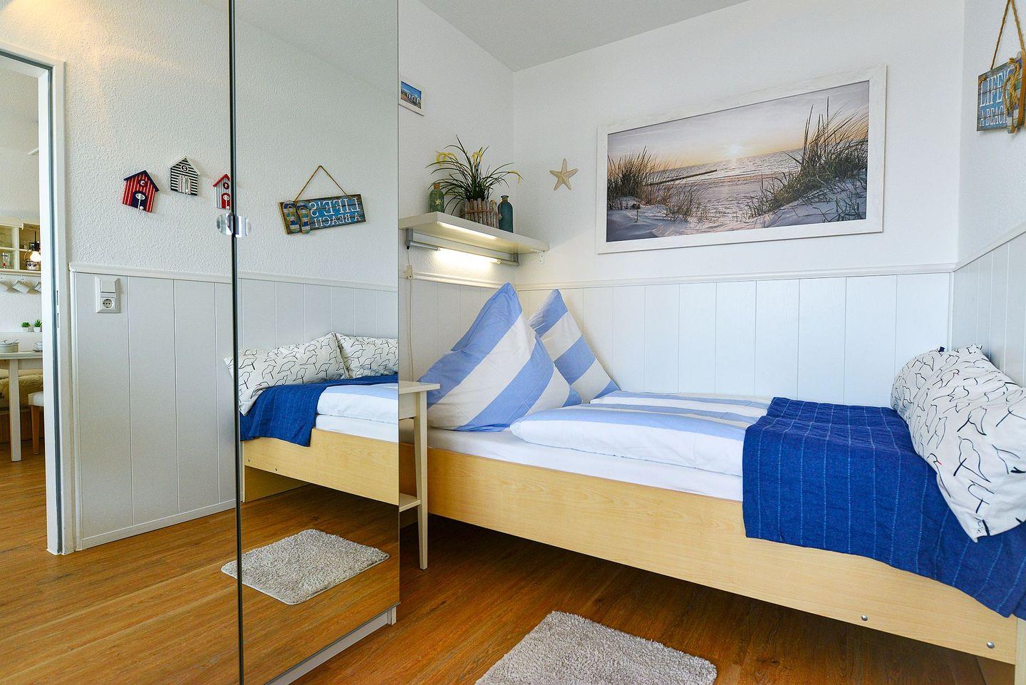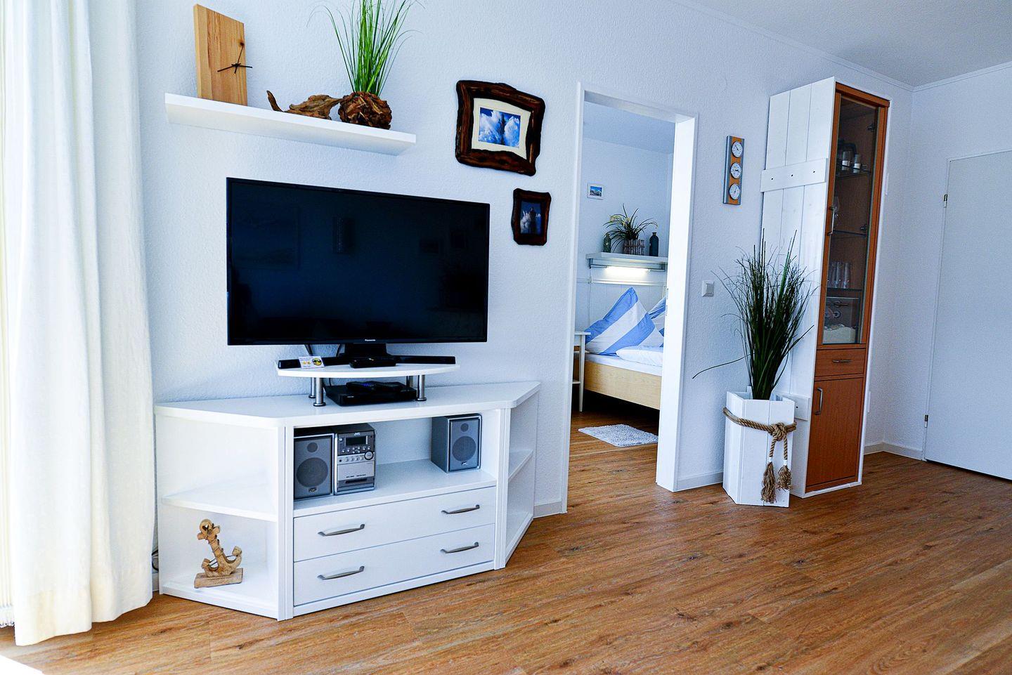 In der vollausgestatteten Küche lassen sich Mahlzeiten bequem zubereiten, während das separate Schlafzimmer mit einem zusätzlichen TV für entspannte Abende und Privatsphäre sorgt. Das Badezimmer ist funktional gestaltet und mit einer Badewanne ausgestattet – perfekt für eine erholsame Auszeit nach einem Strandtag. Ein Highlight ist das helle Wohnzimmer mit einem komfortablen Schlafsofa, von dem aus Sie sogar seitlichen Blick aufs Meer genießen können. Der überdachte Südbalkon lädt zudem dazu ein, den Abend entspannt an der frischen Meeresluft ausklingen zu lassen.