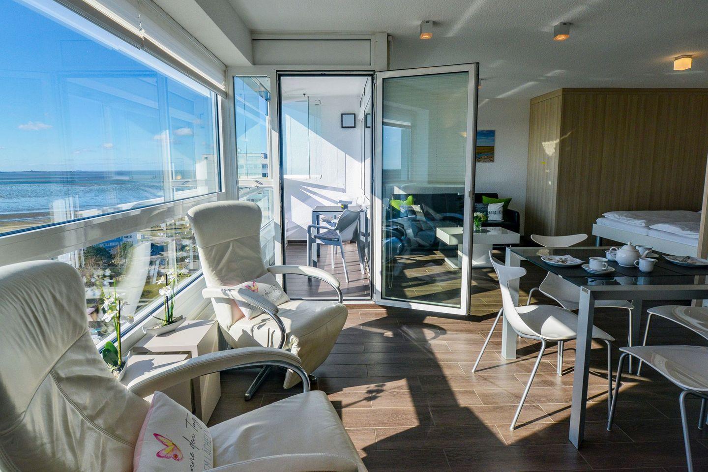 Die Ferienwohnung 1507 in der 15. Etage des beliebten Hauses „Frische Brise“ in Cuxhaven-Sahlenburg ist die ideale Unterkunft für Ihren Nordseeurlaub – großzügig, modern und mit direktem Meerblick.