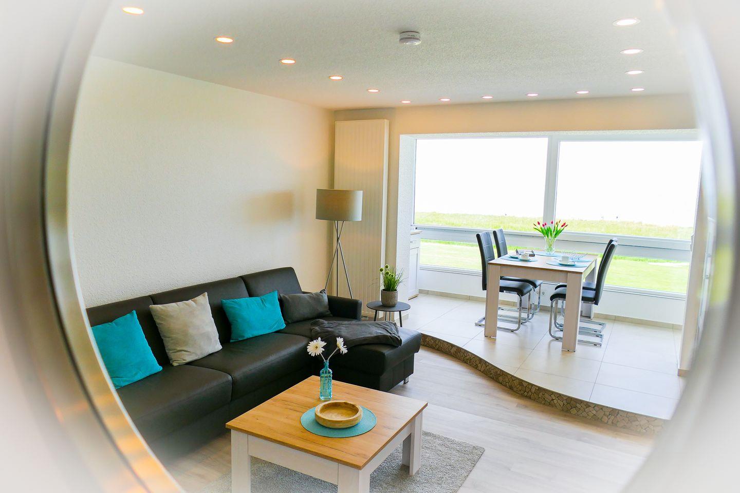 Die verglaste Fensterfront lässt sich öffnen und sorgt dafür, dass Sie stets von bester Meeresluft umgeben sind und bietet Ihnen einen erstklassigen Panoramablick aufs Meer und die Insel Neuwerk.