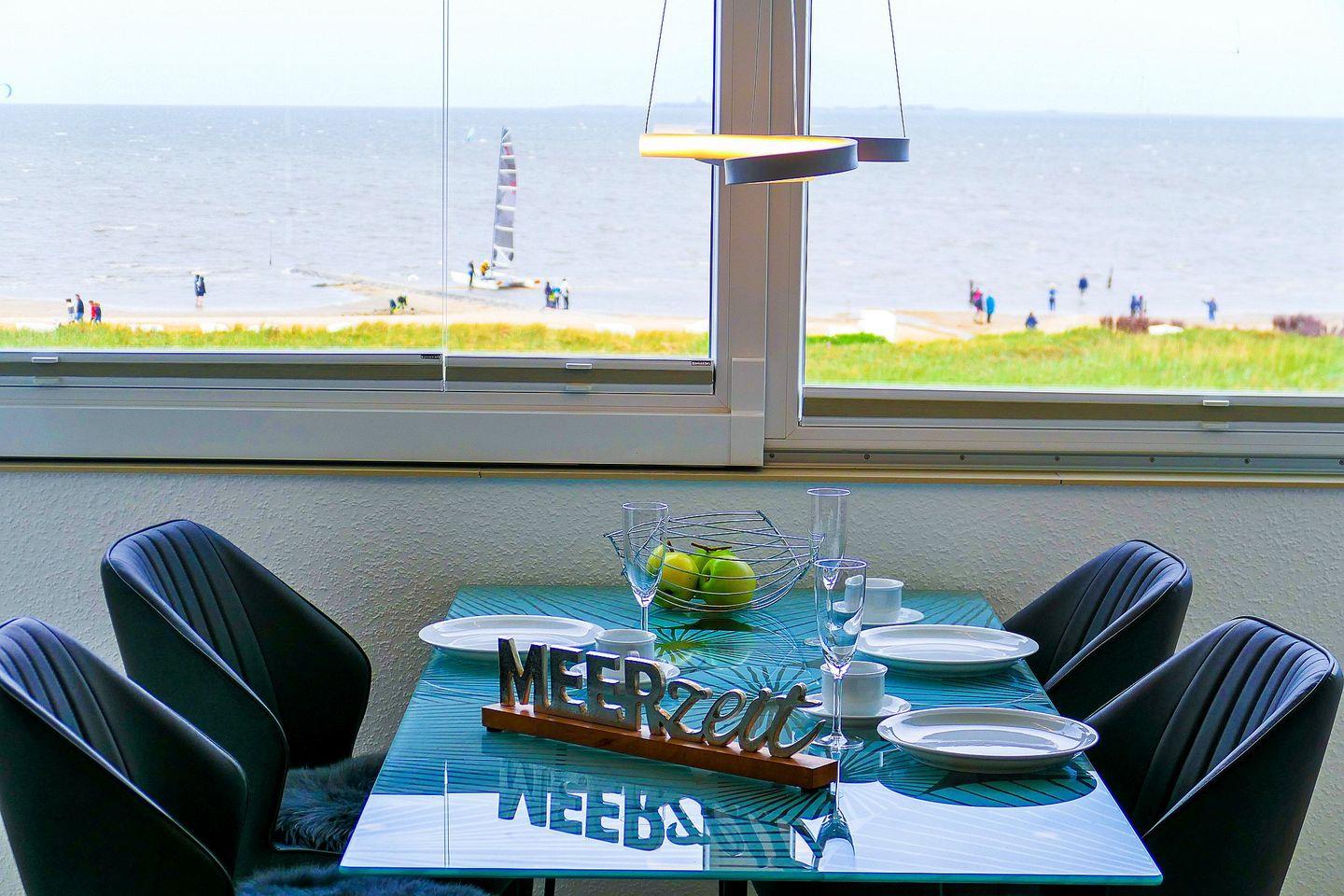 Die große verglaste Fensterfront, die sich komplett öffnen lässt, sorgt dafür, dass Sie stets von bester Meeresluft umgeben sind und bietet Ihnen einen erstklassigen Panoramablick aufs Meer und die Insel Neuwerk.