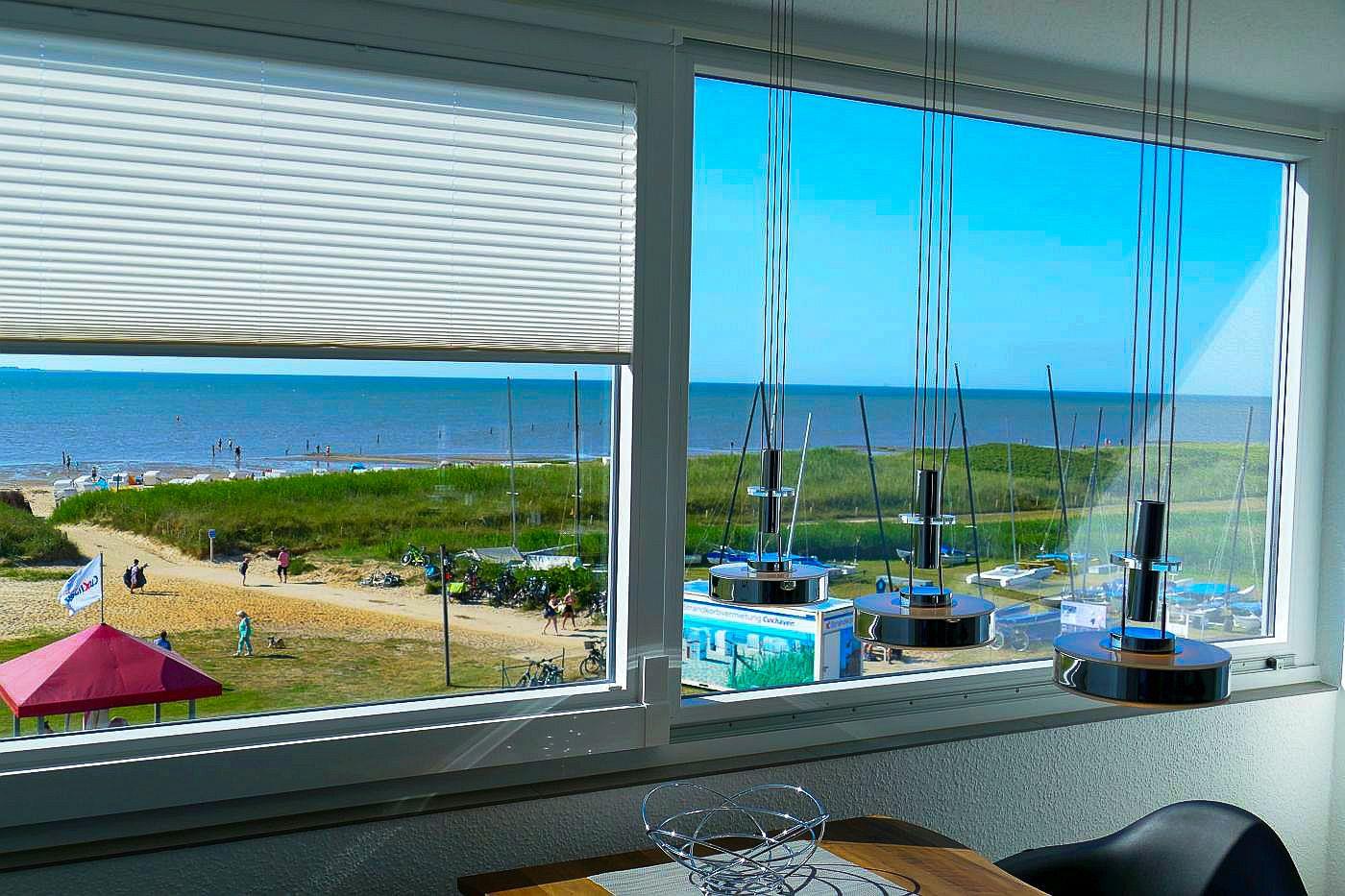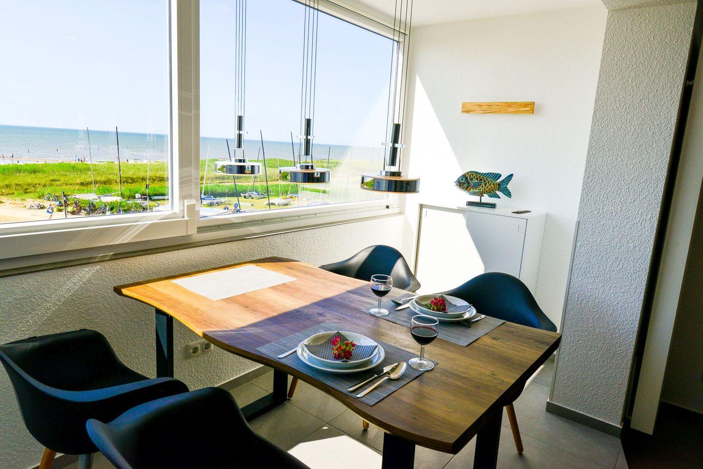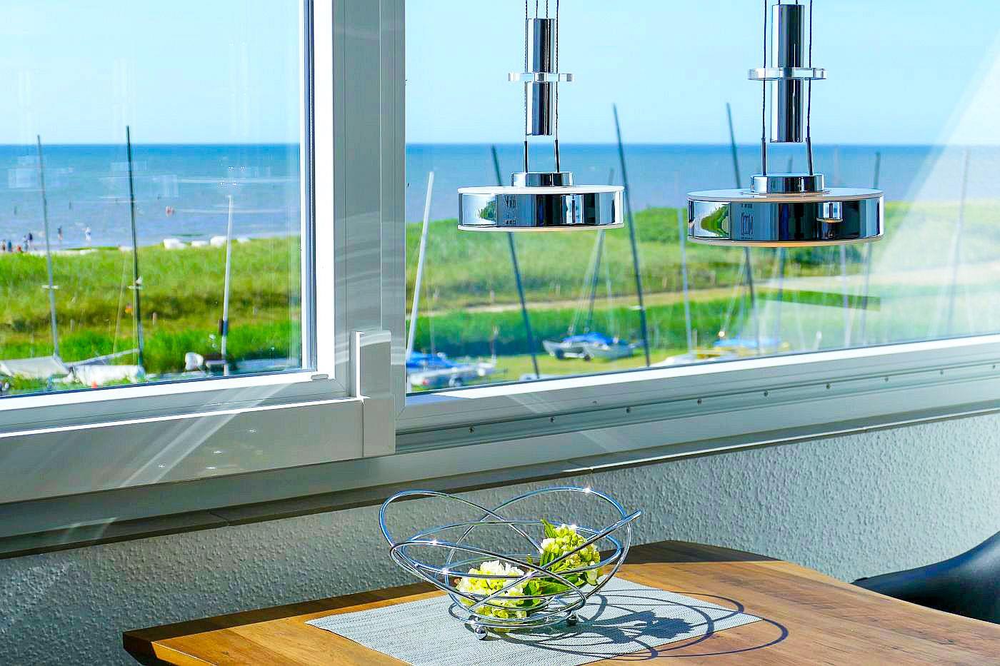 Die große verglaste Fensterfront, die sich komplett öffnen lässt, sorgt dafür, dass Sie stets von bester Meeresluft umgeben sind und bietet Ihnen einen erstklassigen Panoramablick aufs Meer und die Insel Neuwerk.
