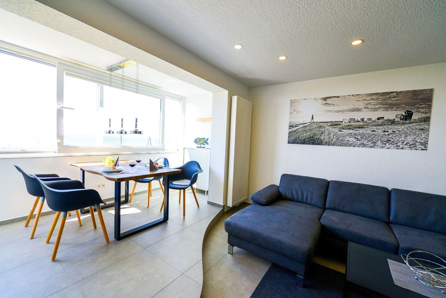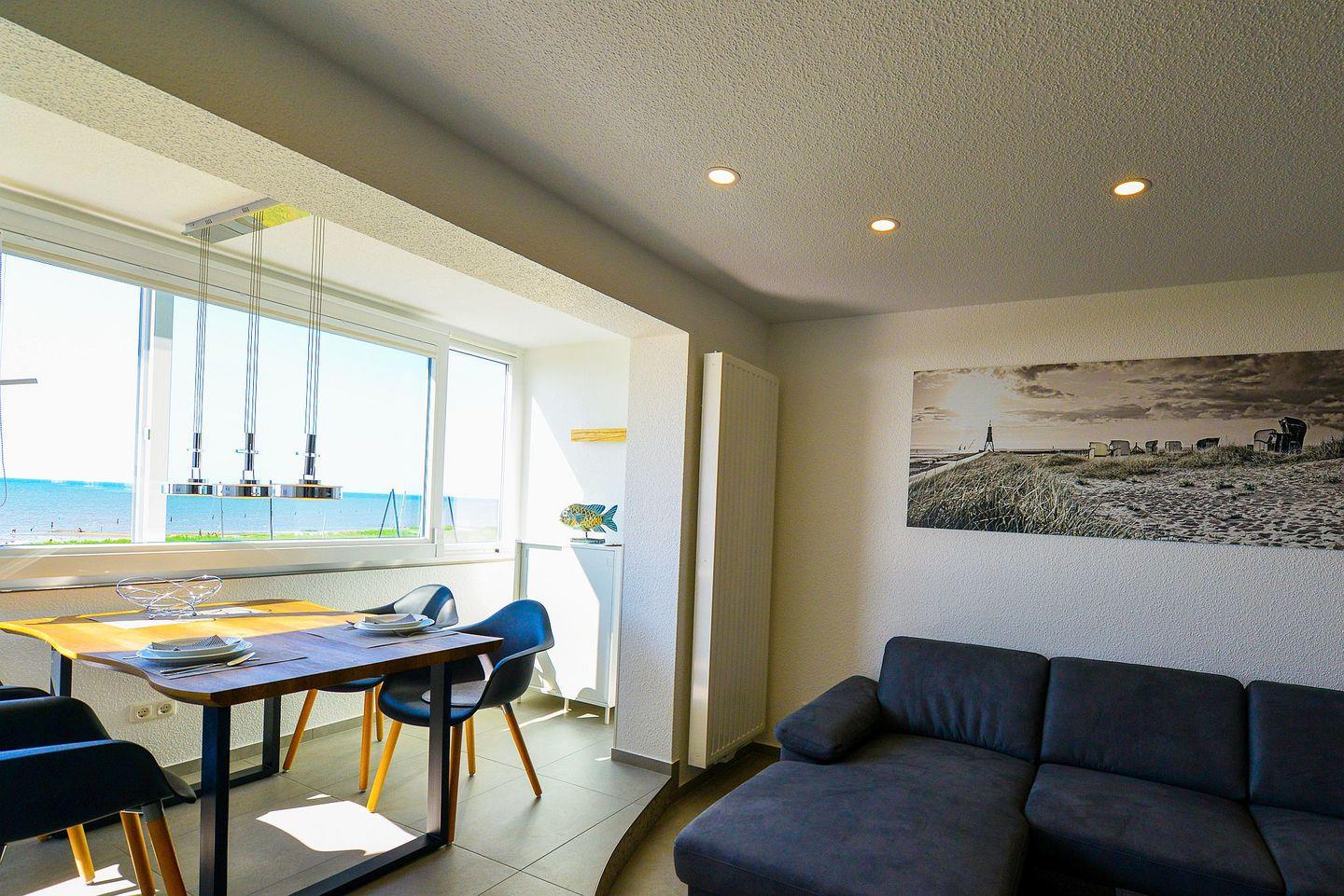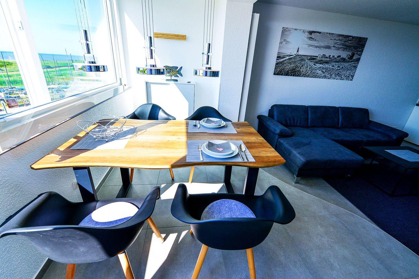 Die große verglaste Fensterfront, die sich komplett öffnen lässt, sorgt dafür, dass Sie stets von bester Meeresluft umgeben sind und bietet Ihnen einen erstklassigen Panoramablick aufs Meer und die Insel Neuwerk.