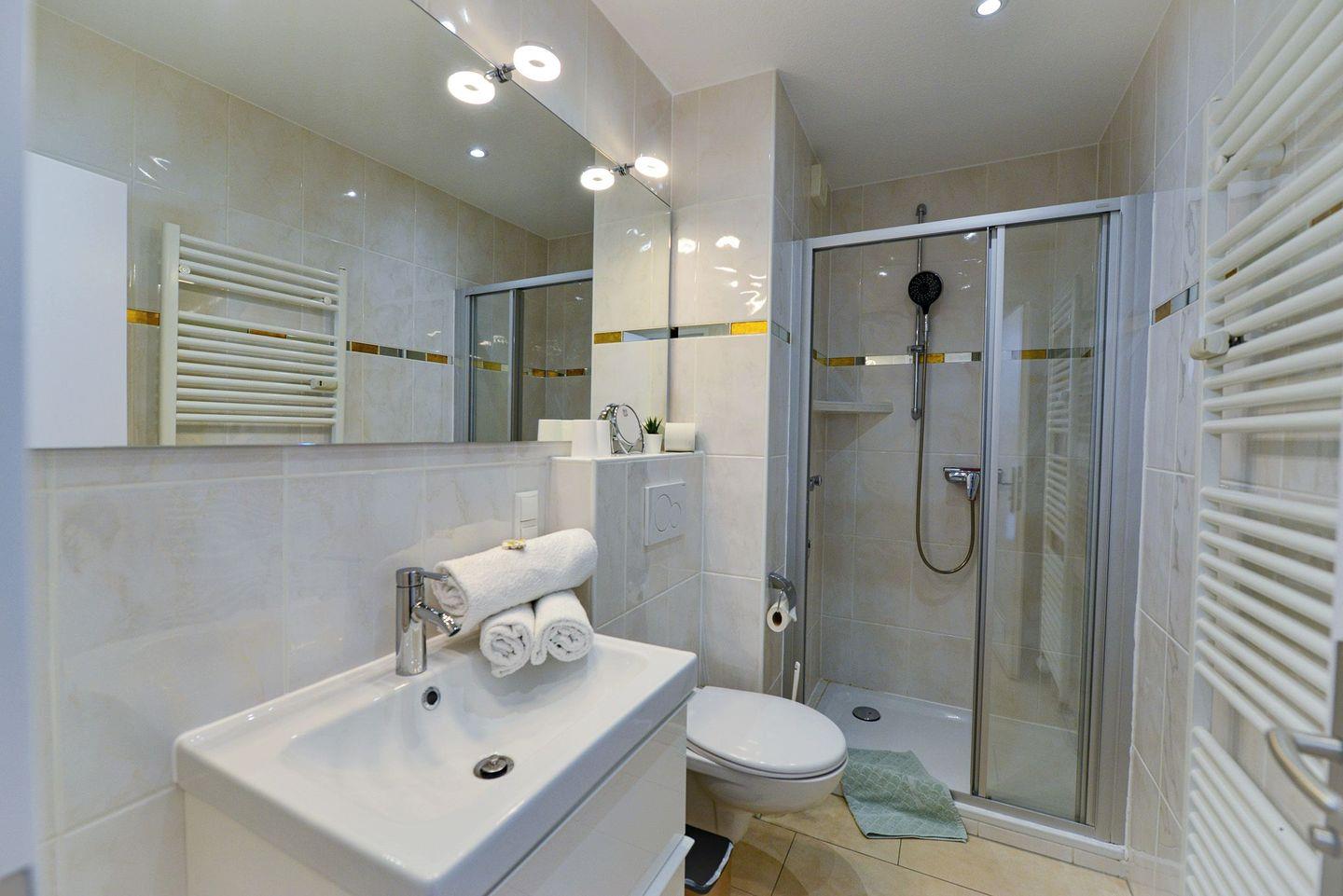 Ein Bäcker im Haus bietet täglich frische Brötchen, ein saisonal geöffnetes Restaurant im Erdgeschoss lädt zum Verweilen ein. Ein fester, kostenloser Parkplatz direkt am Gebäude erleichtert Anreise und Tagesausflüge.