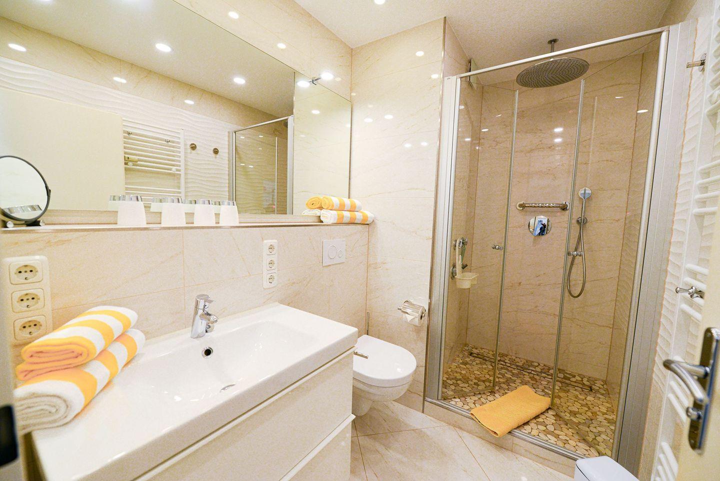 eine komplett ausgestattete Küchenzeile mit Senseo-Kaffeemaschine, drei Fernseher, WLAN, ein stilvolles Bad und einen kostenfreien Parkplatz direkt am Haus. Ein Schwimmbad im Gebäude, ein saisonaler Bäcker mit frischen Brötchen und ein Restaurant im Haus sorgen für zusätzlichen Komfort.